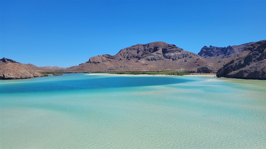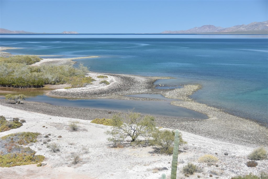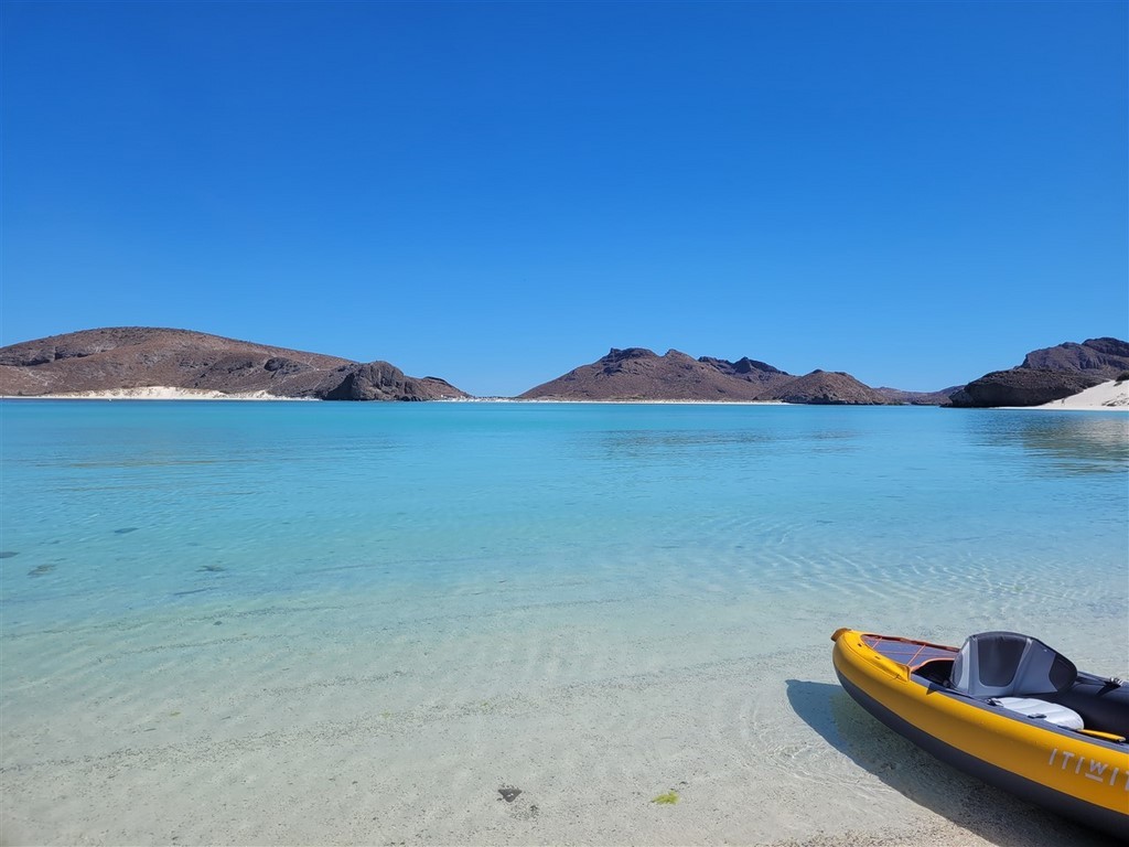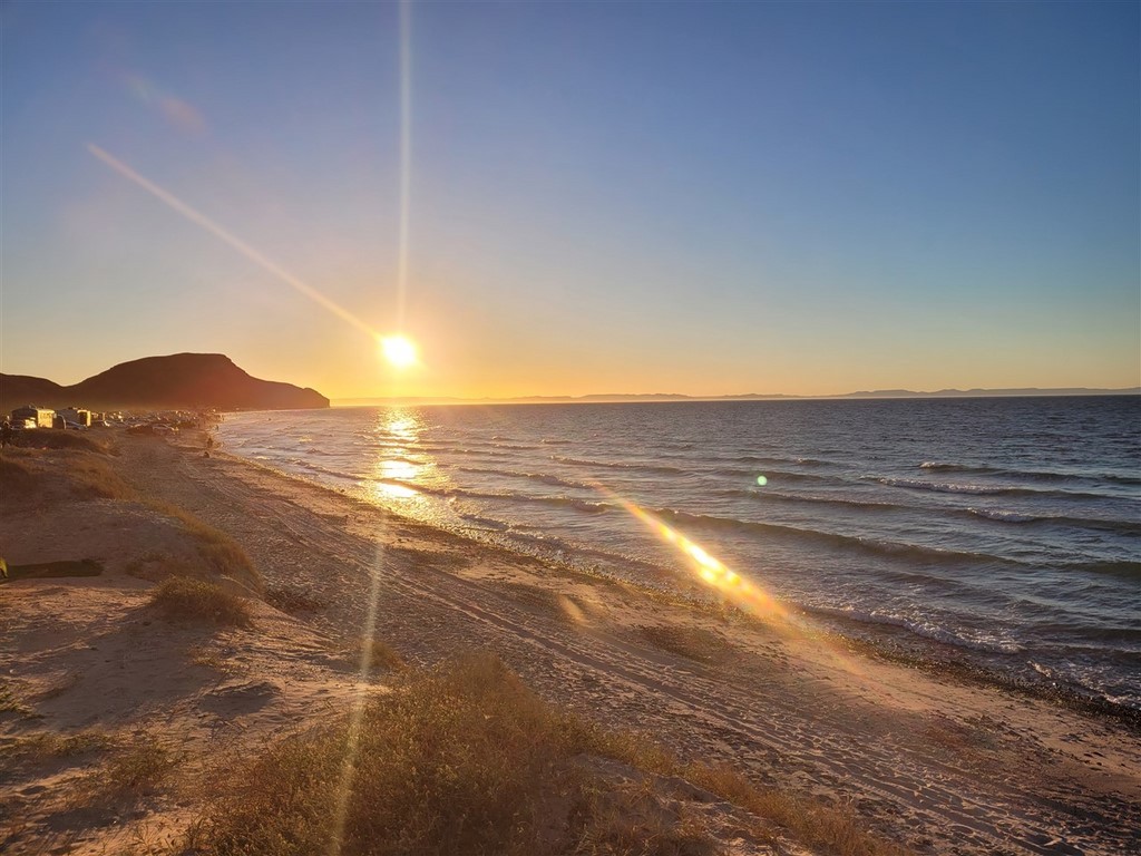 On se régale plus au nord avec les paysages de la mer de Cortez, notamment à El Requeson. Nous sommes garés sur une bande de sable permettant de voir la mer turquoise à droite et à gauche, rattachée à une presqu’île qui devient une île à marée haute. Extraordinaire. Les filles font une sortie kayak au coucher du soleil et reviennent chercher leur mère car des dauphins sont venus près d’elles.