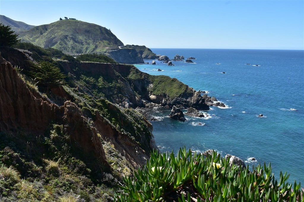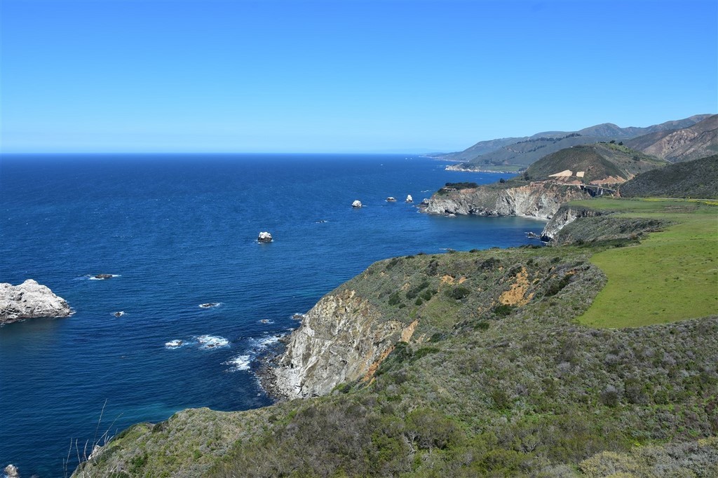 Nous prenons la route de Big Sur depuis Monterey. La route suit l’océan, avec un panorama de falaises, de rochers, de bleu et de blanc des vagues. Ah oui, on peut ajouter parfois le vert printanier de l’herbe. Nous faisons plusieurs arrêts pour profiter du paysage et prendre des photos.