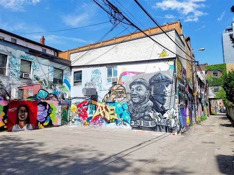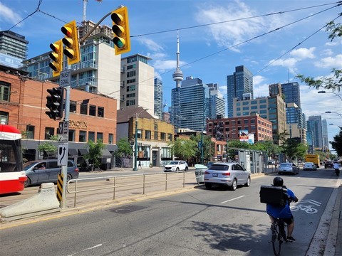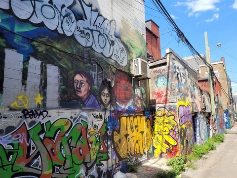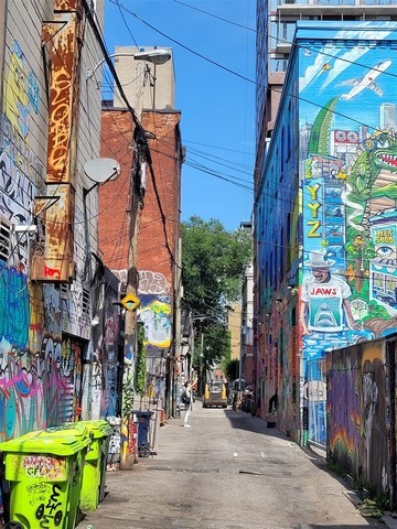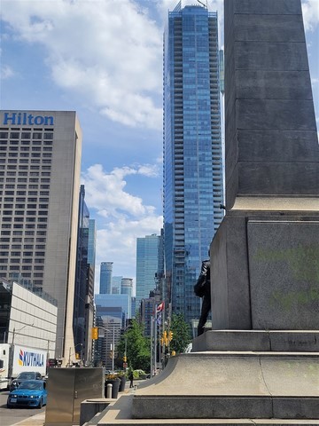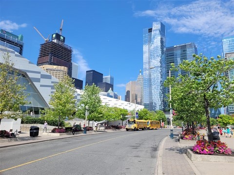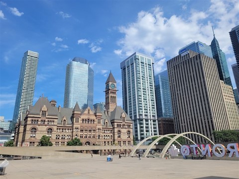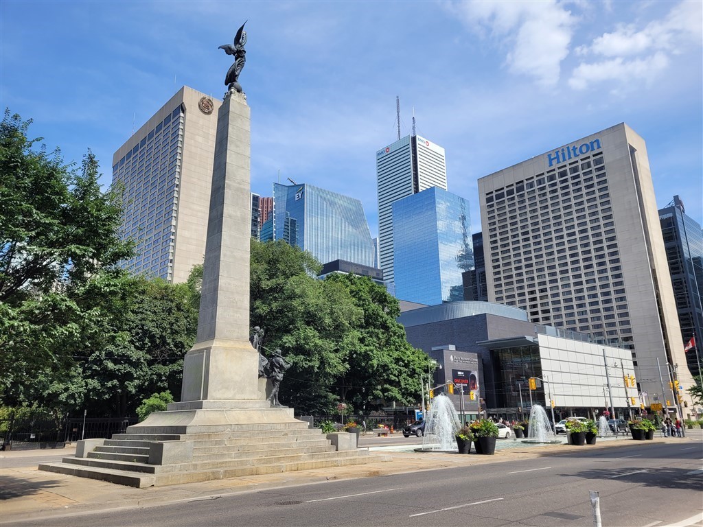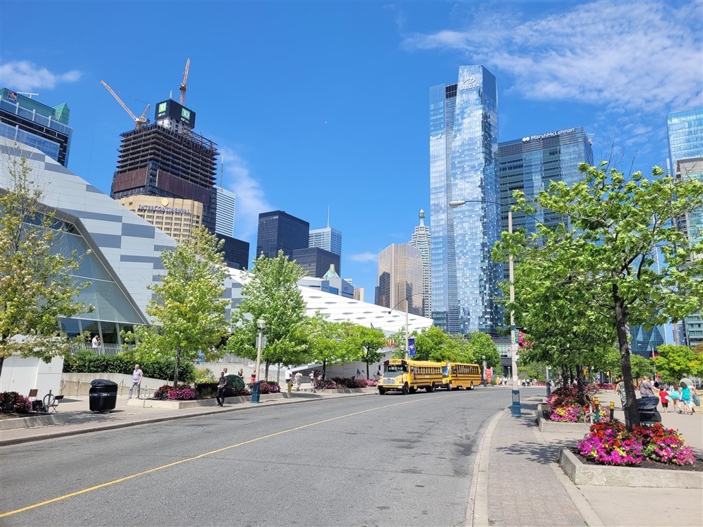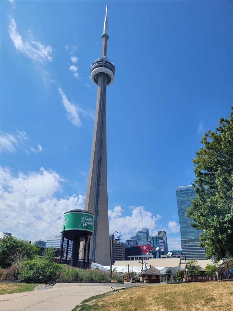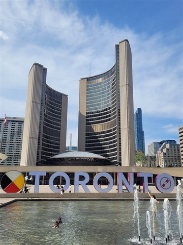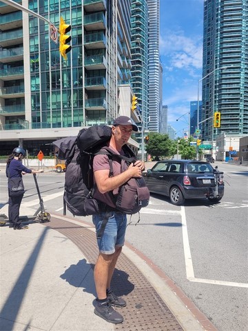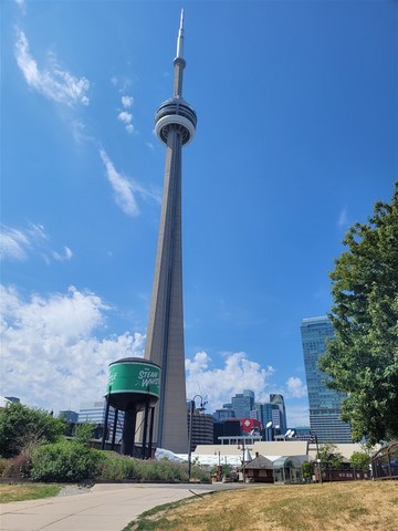 Nous reprenons un bus pour Toronto mais nous décidons de n’y rester qu’un après-midi. Nous en avons un peu marre des villes et ce n'est pas la moindre car c'est la quatrième ville la plus peuplée d’Amérique du Nord et un Canadien sur cinq y vit. La première chose à faire en arrivant est de se débarrasser de nos sacs à dos et nous trouvons un magasin qui les stocke à l’heure, à la journée… Pratique mais un peu loin de la gare, tant pis, on marche. Le gros de Pascal pèse vingt kilos. Cette visite nous permet d’avoir un aperçu de la ville et cela nous suffit.