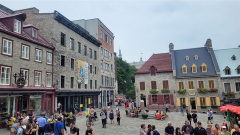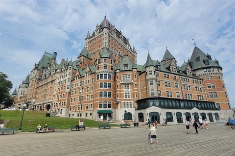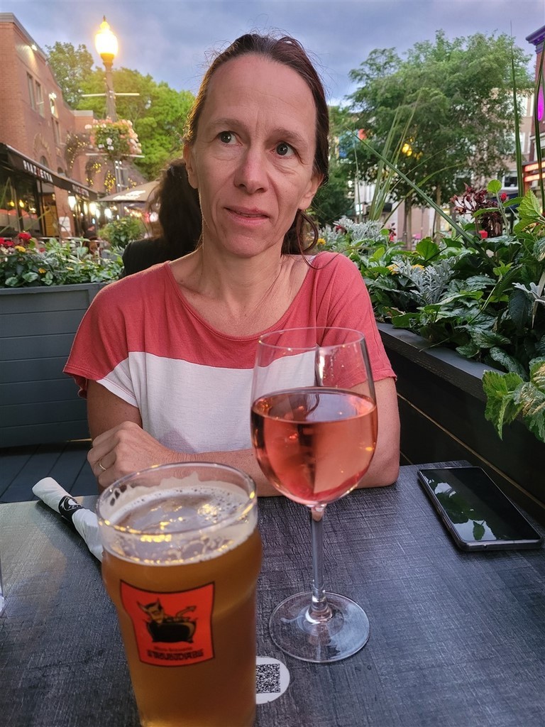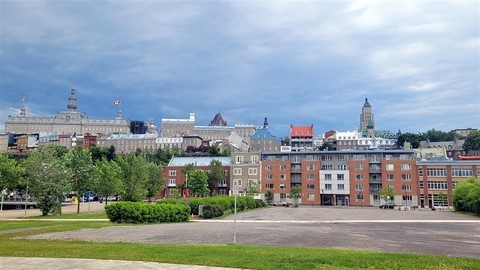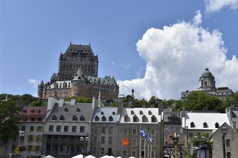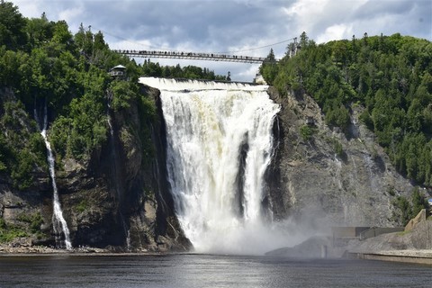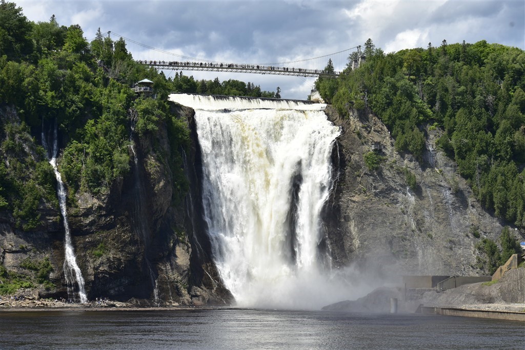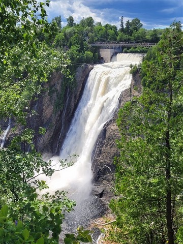 La première ville Québec nous séduit par son calme. Nous apprécions de nous balader dans le vieux Québec. Même s’il y a un certain nombre de touristes, on a l’impression qu’ils ne font pas de bruit, tout comme les voitures, beaucoup électriques. Le Canada a décidé de fêter notre arrivée par un feu d’artifice. Merci à lui. En effet le 1er juillet c’est la fête nationale du Canada. Nous nous familiarisons avec les prix du Canada : boire un verre en terrasse 20$ à deux soit environ 15€, un repas juste avec un plat et un verre 90$, une location de vélo électrique pour la journée pour 180$. Le retard du camping-car coûte cher. Nous faisons attention en mangeant dans notre chambre qui est dotée de tout le nécessaire pour cuisiner et Pascal est privé de bière au festival de la bière (20$ le verre à l’entrée avant de devoir payer sa bière). Mais la location des vélos électriques nous permet de pédaler sur l’Ile d’Orléans et d’aller voir les chutes de Montmorency. 62km c’est sympa de ne pas être trop crever pour escaler ensuite les 487 marches des chutes !