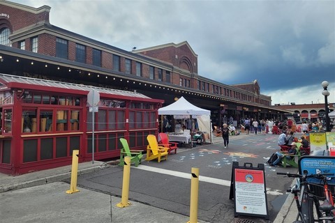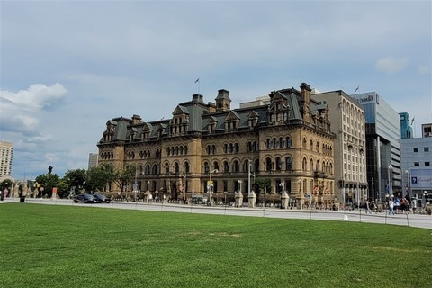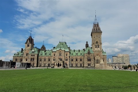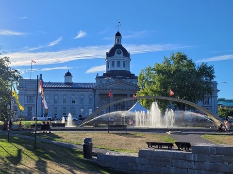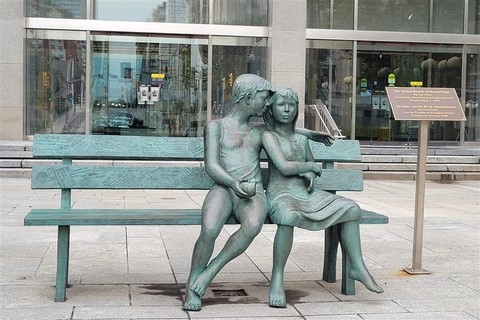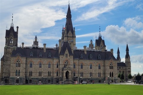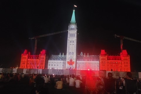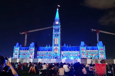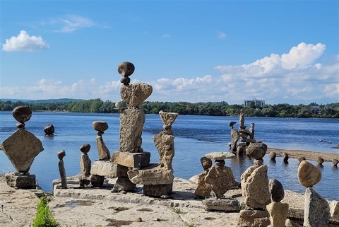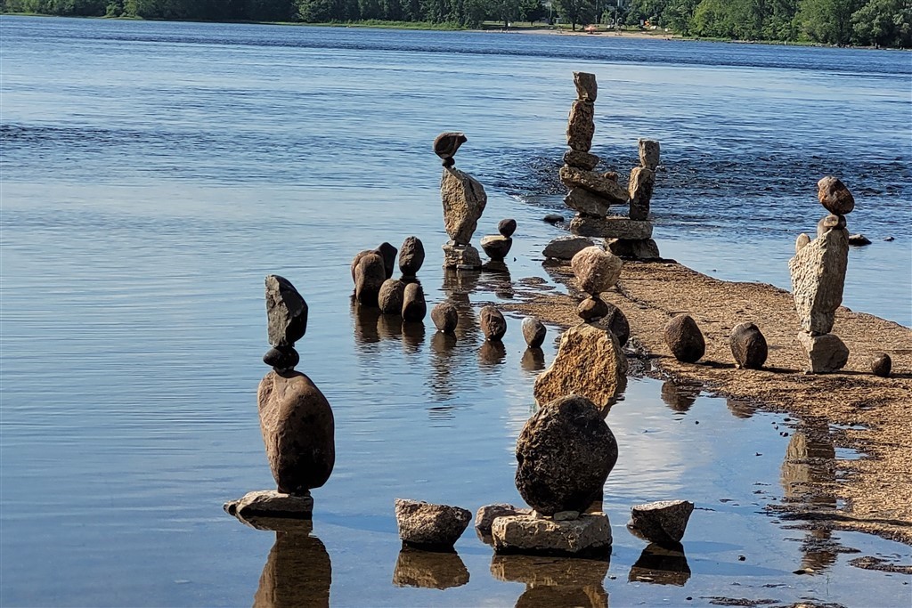 Nous étions réticents à visiter Ottawa : c’est encore une ville pleine de buildings, et même les Canadiens que nous avons croisés n’en font pas spécialement des éloges. Mais bon, on est sur sa route donc on s’arrête. Finalement, sa visite avec nos vélos en une journée nous ravit car même en plein centre-ville, il y a des pistes cyclables partout. La circulation est peu dense et on ne déplore même pas une chute de Pascal ! Nous passons par le marché Byward où nous testons les queues de castors : c’est un beignet allongé et plat, d’où son nom. Nous voyons aussi la basilique-cathédrale Notre-Dame, les chutes Rideau, le parlement, le château Laurier, la cour suprême, les écluses du canal Rideau. Quelques kilomètres de plus nous emmènent pour une petite balade le long de la rivière Ottawa. Un ensemble de sculptures de pierres sur et au bord de l’eau attire notre attention. Un écriteau indique : « Hommage aux enfants perdus. Bienvenue chez vous ». Nous y restons un bon moment à contempler ces pierres en forme d’ « enfants » sur une lumière de fin de journée, l’eau est d’un joli bleu et avec en fond des gratte-ciels de Ottawa. C’est un petit coup de cœur d’Ottawa. Le premier soir, nous assistons à un grand feu d’artifice. C’est notre troisième depuis notre arrivée. Le second soir, un son et lumière sur le parlement explique l’histoire du Canada.