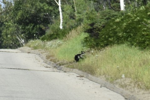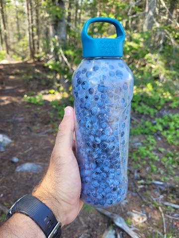 Nous ne restons pas que statiques face aux cétacés, une petite rando d’une quinzaine de kilomètres au Cap de la Baie Sainte Marguerite permet de revenir avec une bouteille d’eau pleine de bleuets, le cousin de la myrtille. Ce fut un régal dans nos assiettes. C'est dans ce secteur que nous verrons nos premiers ours traverser la route. Avec la surprise et le temps de prendre l'appareil photo, nous n'aurons que les fesses du bébé, Maman ayant déjà détalé !