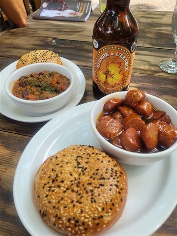 Il faut bien quitter cet emplacement un jour. La lecture du site de nos amis Nat et Jean nous emmène le 3 août à la sucrerie de la montagne à Rigaud. C’est une cabane à sucre, c’est-à-dire un endroit où l’on produit le sirop d’érable. La propriété compte 2000 érables mais 1000 sont exploités. L’endroit est perdu, magique. Il est reconnu site du patrimoine du Québec. La sucrière est un peu l’apologie de son propriétaire Pierre Faucher qui est un personnage haut en couleur. Il y a même un livre qui nous est remis gracieusement. La plupart des sucreries propose des repas traditionnels. Nous goûtons trois plats, la soupe aux pois, le chili de bison et les saucisses glacées au sirop d’érable. Pas de dessert car la tarte au sucre est déjà dans notre frigo. Pascal est obligé de tester la bière à l’érable. Les saucisses glacées au sirop d’érable sont une tuerie, la sauce est tellement bonne que Pascale la mange à la cuillère. Elle est épicée, comme il se doit, et Pascale est obligée de boire un peu de bière à l’érable. Un topo sur la production du sirop d’érable nous permet de découvrir le processus de récupération de l’eau d’érable puis sa transformation en sirop d’érable. L’établissement indique qu’il est en manque de personnel. Ils sont dix et devraient être vingt. La situation est semblable au Canada et des panneaux « recherche employé » sont très souvent apposés sur les commerces. Après avoir testé le beurre d’érable, nous repartons avec un petit pot, quelques flacons de sirop d’érable et du sucre d’érable.