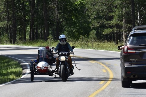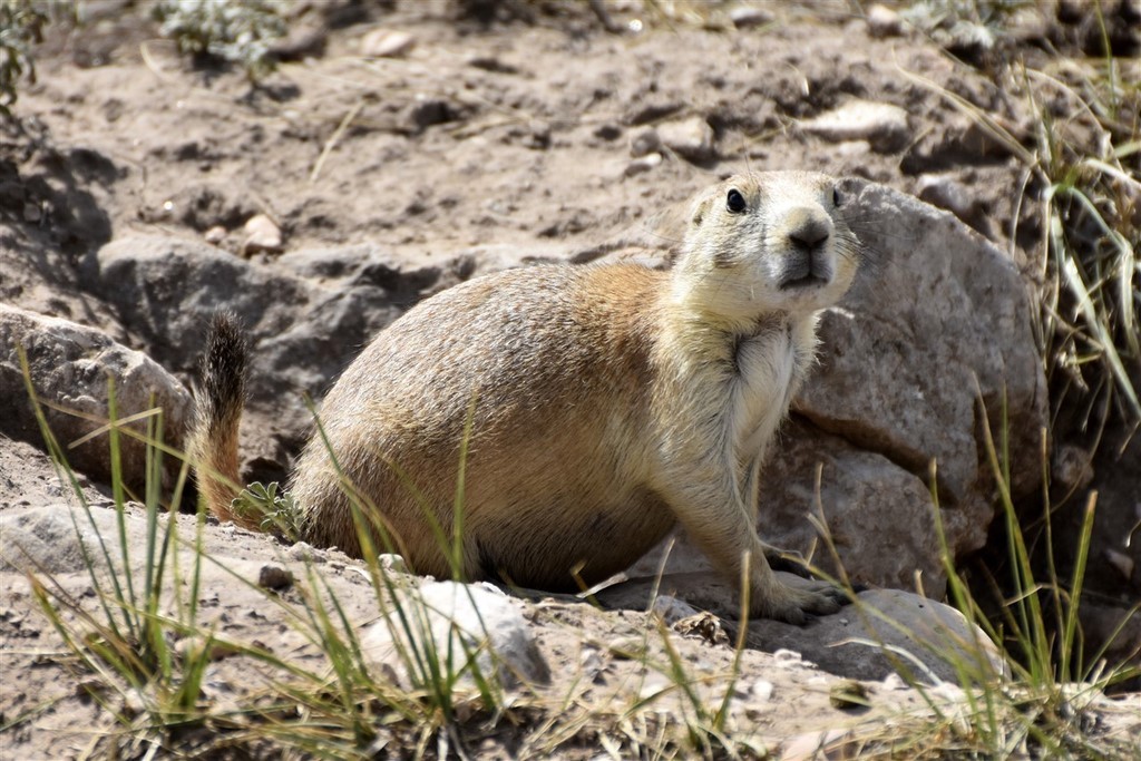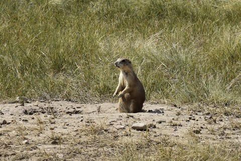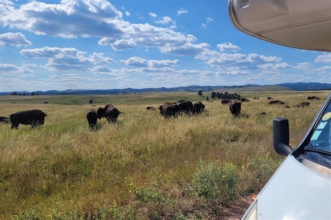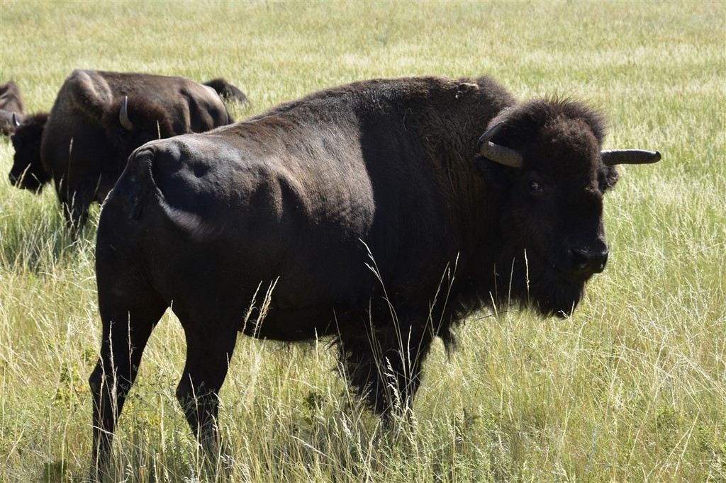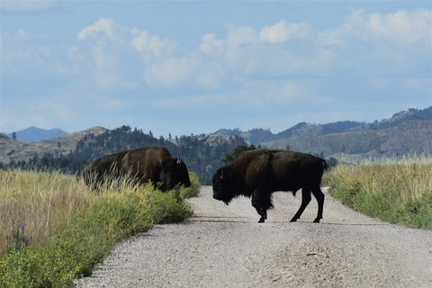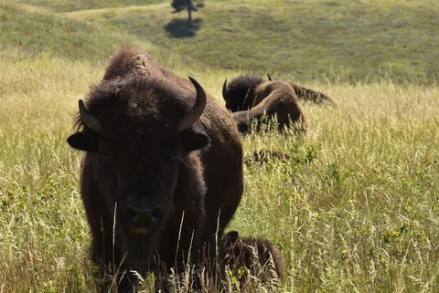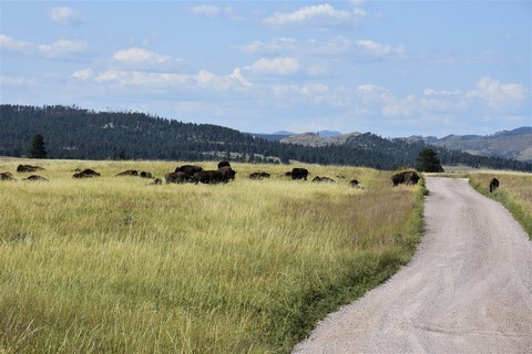 Nous délaissons le Cluster Federal Park qui clame être un grand parc de bisons mais où il faut payer 30$ l’entrée. Nous privilégions le Wind Cave National Park puisque nous avons maintenant le pass annuel. Nous sommes un peu déçus à notre premier passage sur la route principale car nous ne voyons rien, si ce n’est des chiens de prairie, à la grande joie de Pascale. Ce n’est que lorsque nous prenons une piste que nous sommes récompensés : un troupeau de bisons nous attend sur le bord de la route, à faire la sieste en cette chaleur d’après-midi. Ils sont une bonne cinquantaine, mâles, femelles, bébés, rien que pour nous. Nous pourrions presque les toucher.