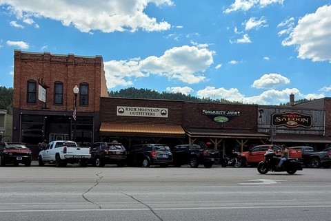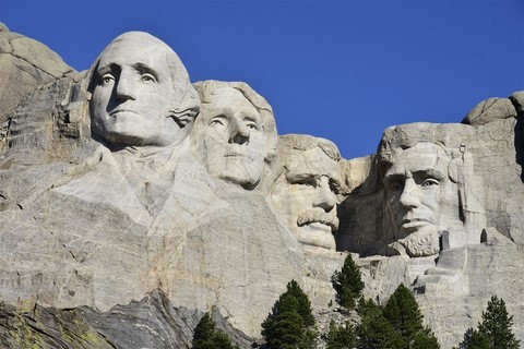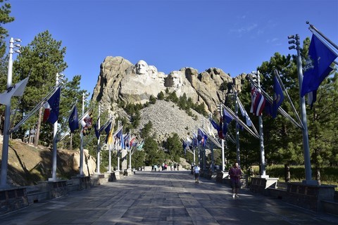 La journée d’après nous emmène de bon matin au mont Rushmore. Le site est calme à cette heure et nous sommes tranquilles pour photographier Washington puis Jefferson, Roosevelt et Lincoln (de gauche à droite). La sculpture haute de dix-huit mètres a été construite entre 1927 et 1941 par Gutzon Borglum mais terminée par son fils et surtout par quatre cents ouvriers. Une longue avenue bordée des drapeaux de tous les états américains permet d’arriver à la terrasse face aux sculptures. Nous ne contentons pas de la vue sur la terrasse mais effectuons le petit parcours appelé President trail afin d’avoir d’autres vues sous d’autres angles. Cela fait tout drôle de voir réellement ces sculptures alors qu’on les a vues sur des livres ou à la télé.
