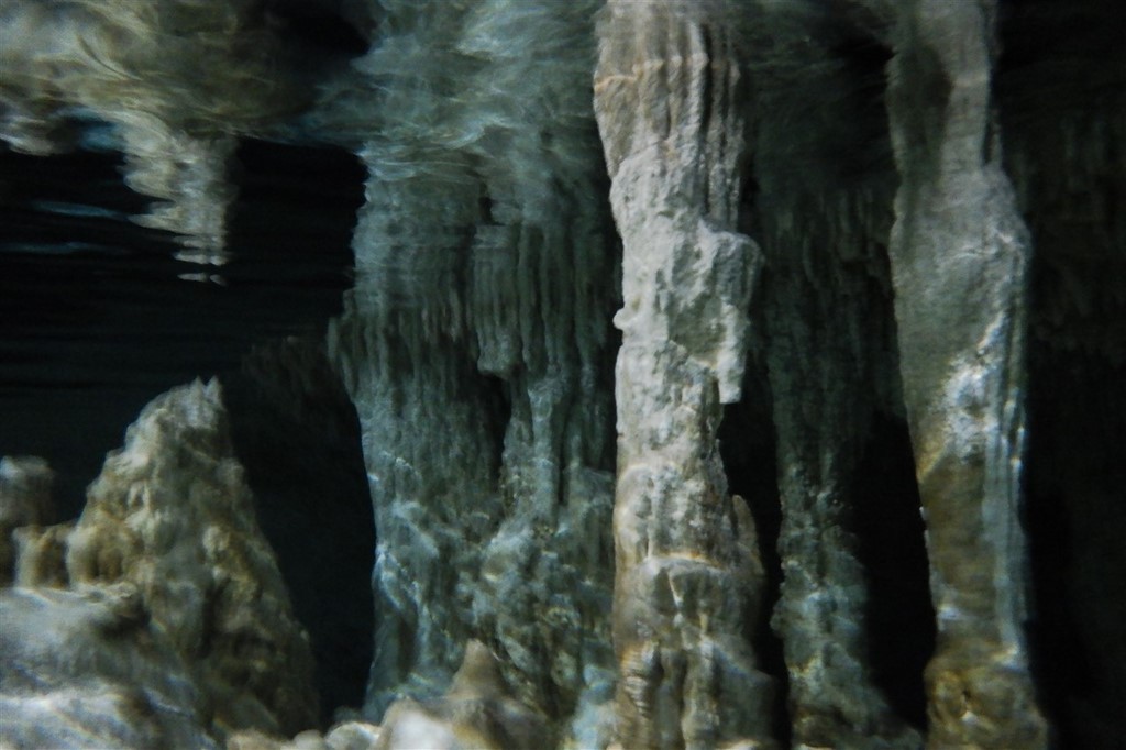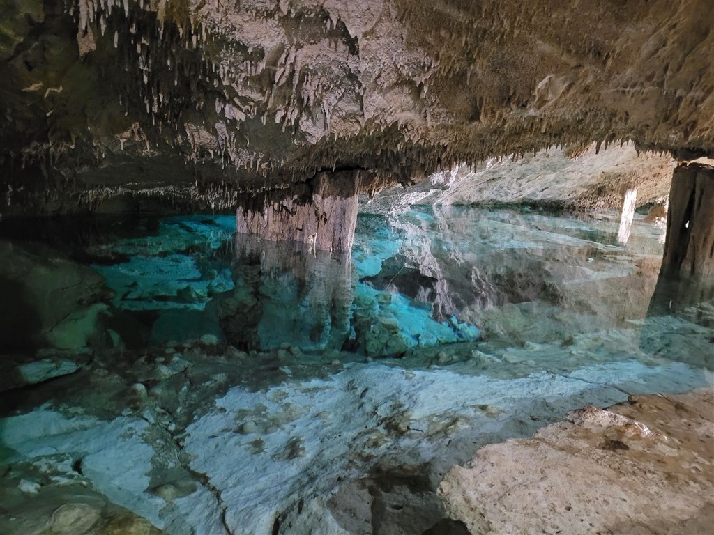 La découverte de notre première cénote, la cénote Taak Bi Ha, nous régale même s’il faut rouler sur des kilomètres de piste pas trop mauvaise. L’eau est bleue, verte, turquoise. Il y a des stalactites qui descendent jusqu’à l'eau. On se baigne avec masque et tuba pour mieux voir le fond. Cette cénote est une belle découverte.