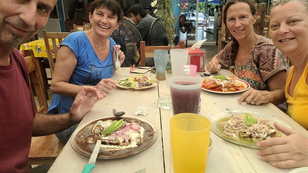 Christine et Delphine commencent à s’habituer aux repas des petits restaurants locaux, chilaquiles, tacos, enchiladas, burritos… et l’eau du jour au tamarin ou à l’hibiscus et surtout aux petits prix. Elles n’aiment pas trop l’horchata, la boisson à base de farine de riz.