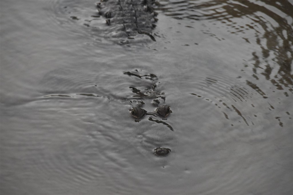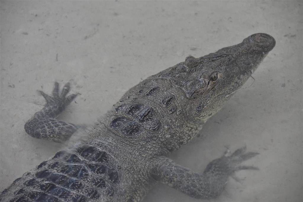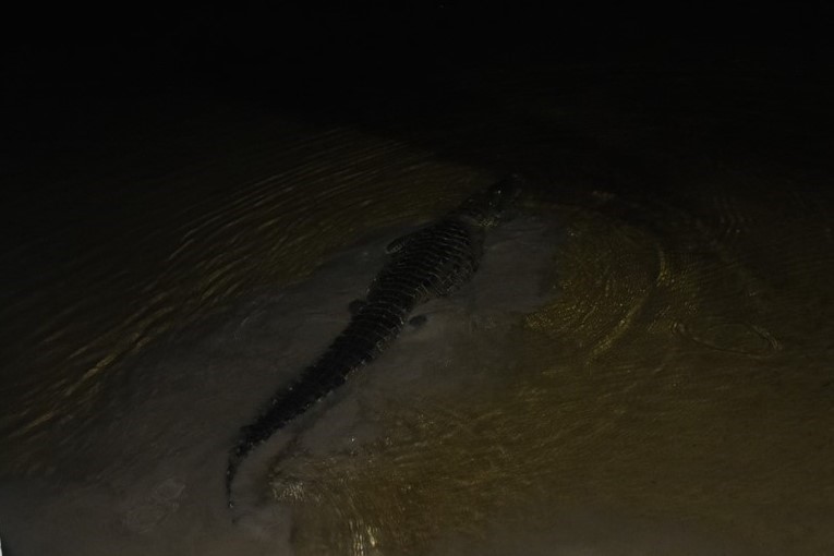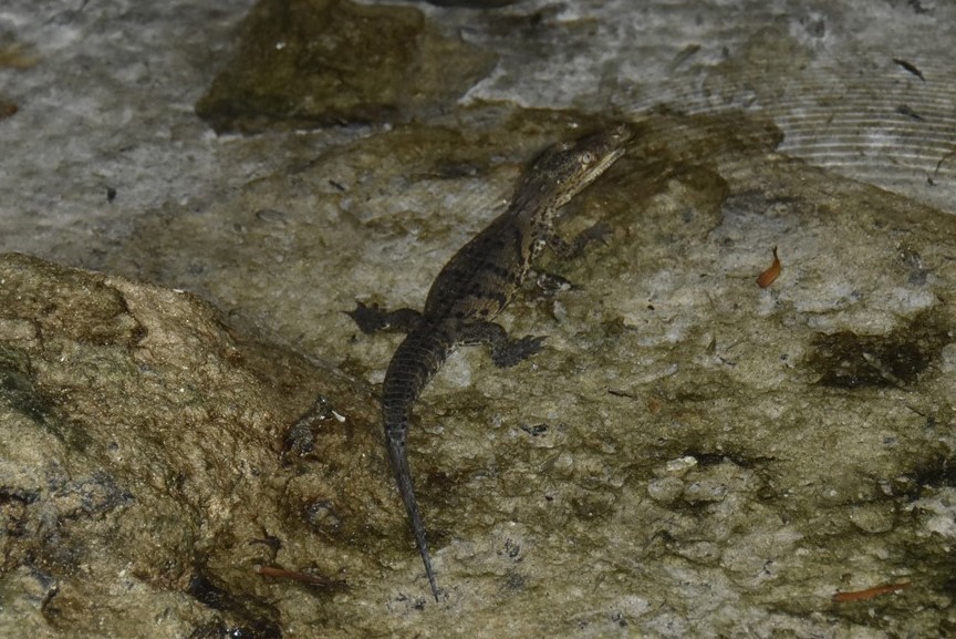Cela fait déjà 10 jours que Christine et Delphine sont là. Une surprise les attend à Rio Lagartos quand nous sortons vers 22h00 et que des yeux rouges brillent sur l’eau. Des crocodiles sont là, tranquilles au bord de l’eau : d'abord un bébé, puis un beaucoup plus gros. On refait une toute petite boucle de nuit dans la jungle mais nous ne distinguons pas d’autre bébête. Seul un raton-laveur est actif dans la poubelle près de Dédé. En revanche, à 6h00, le lendemain, Pascale réveille tout le monde, un autre crocodile nous attend.