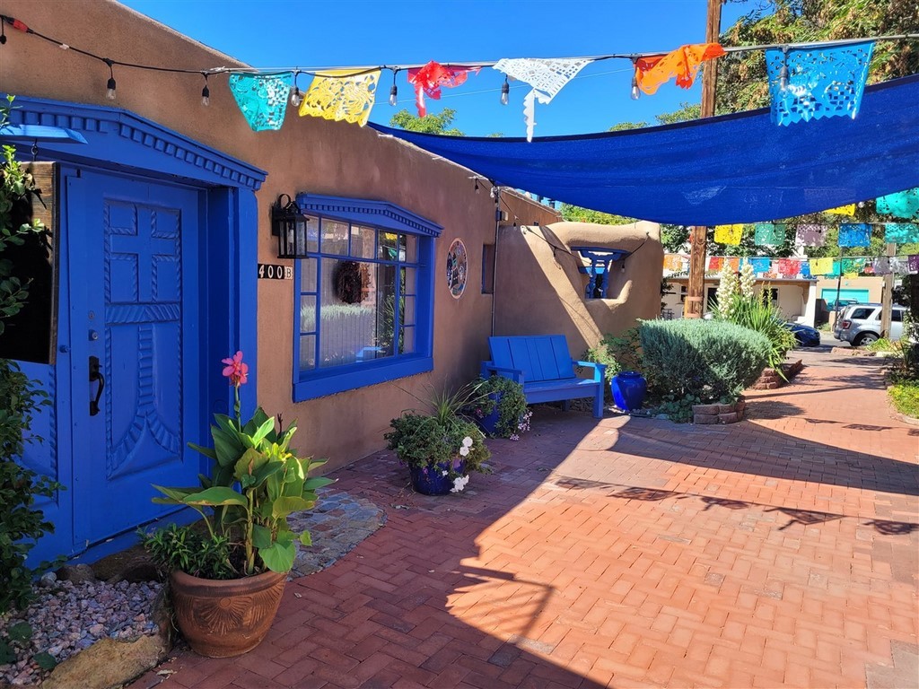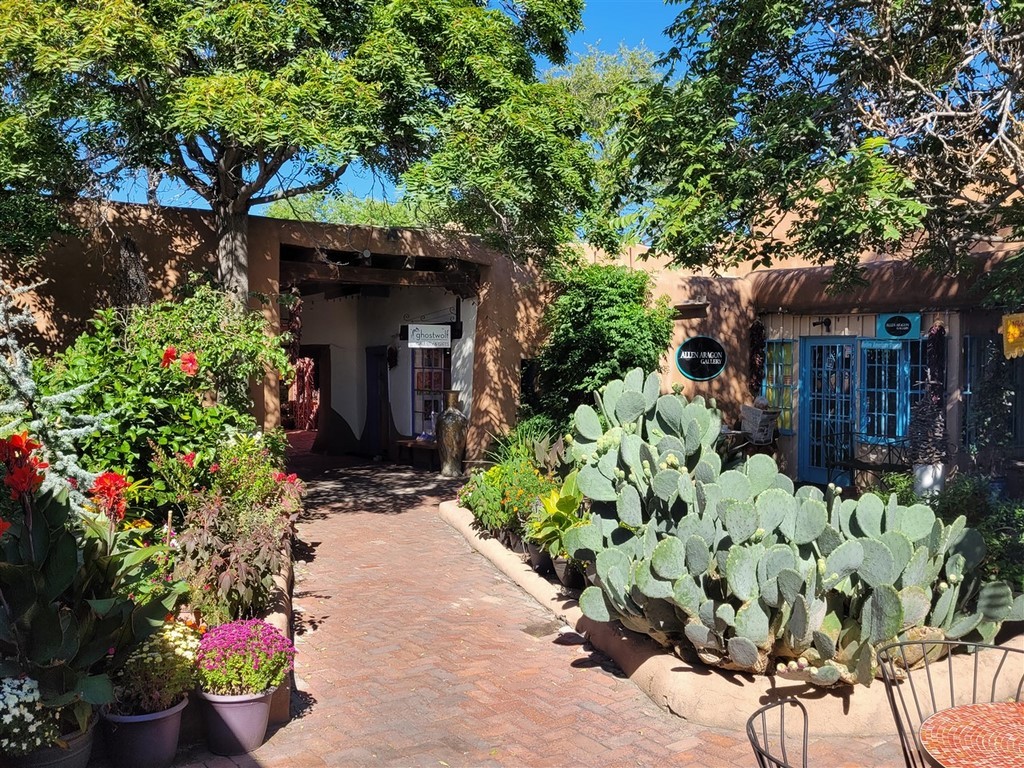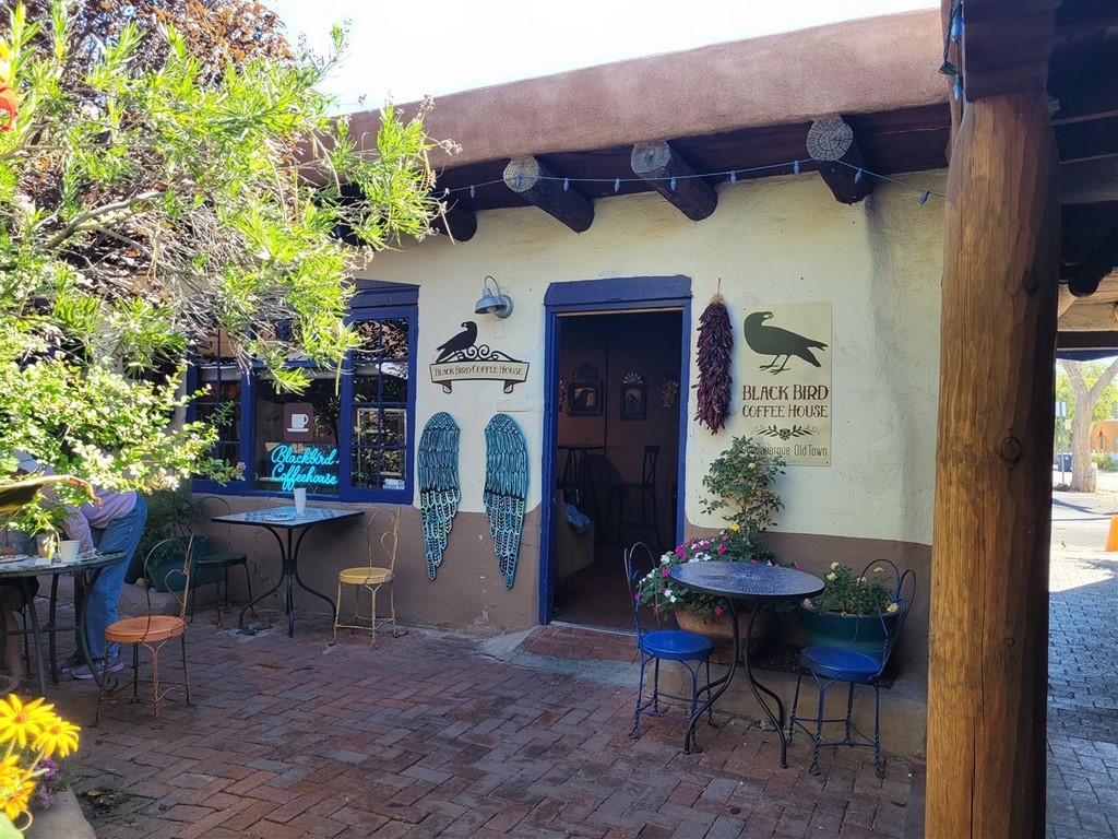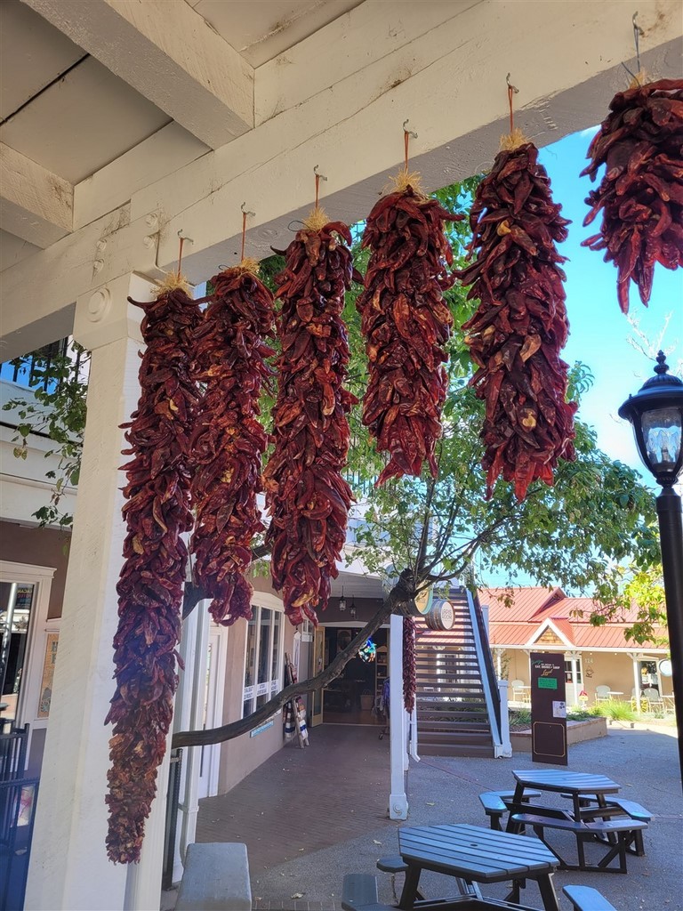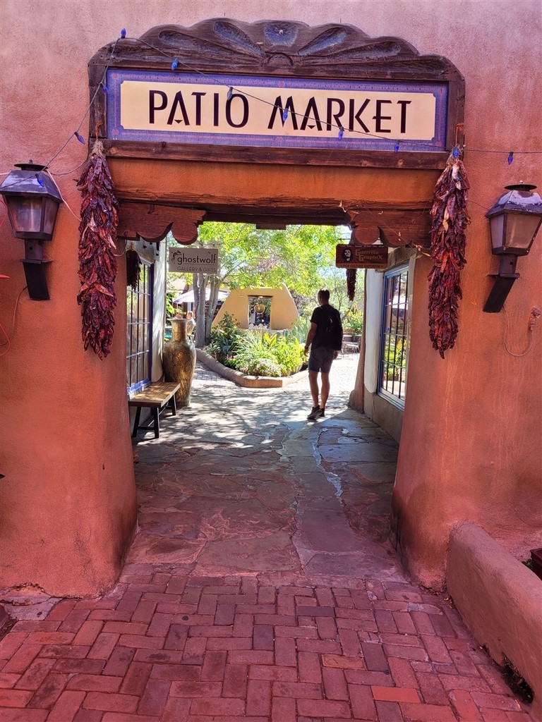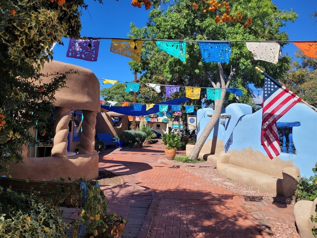 Albuberque est un nom de ville du Nouveau-Mexique difficile à prononcer pour nous. Ne serait-on pas déjà arrivés au Mexique ? Le centre-ville est tout petit et on adore les maisons en briques d’adobe. L'adobe est de l’argile mélangée à de l’eau et de paille hachée ou d'un autre liant. Les patios fleuris avec des tables invitent à une pause.