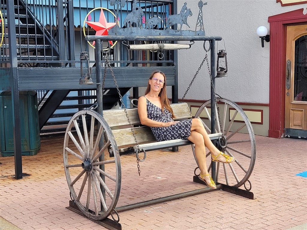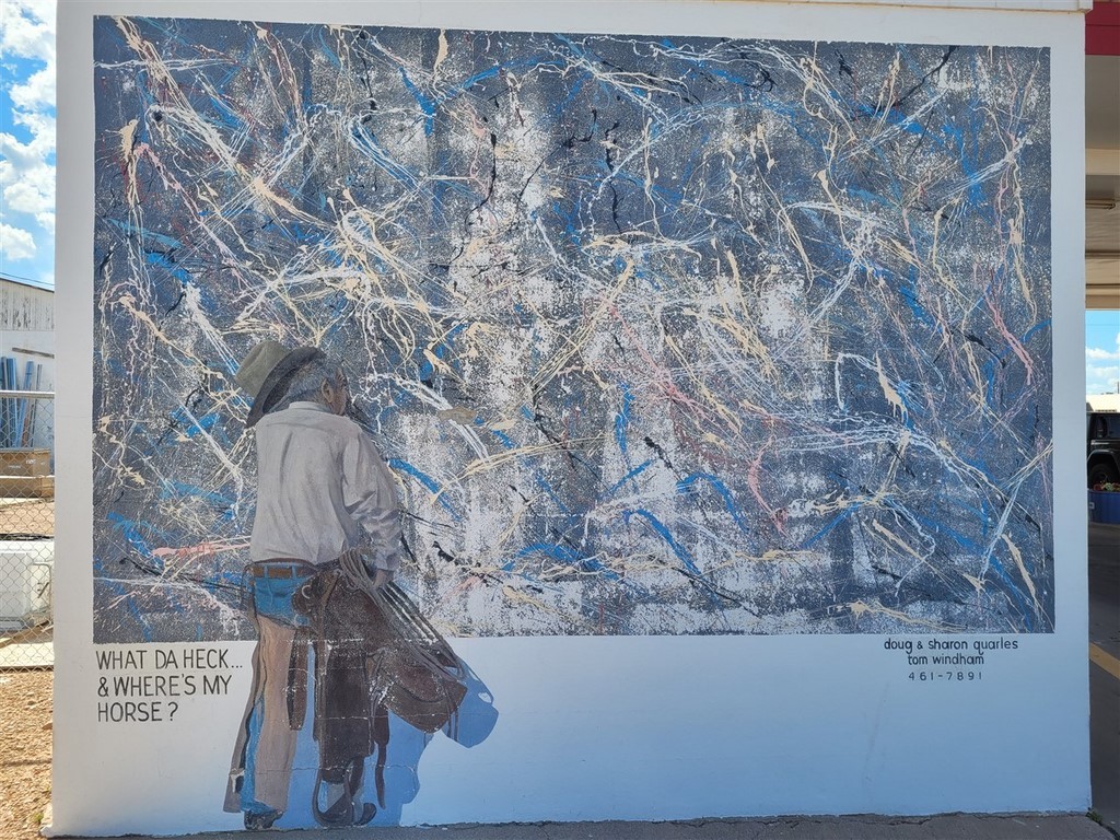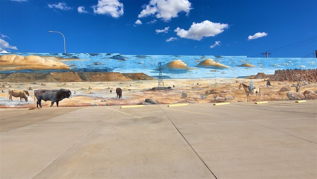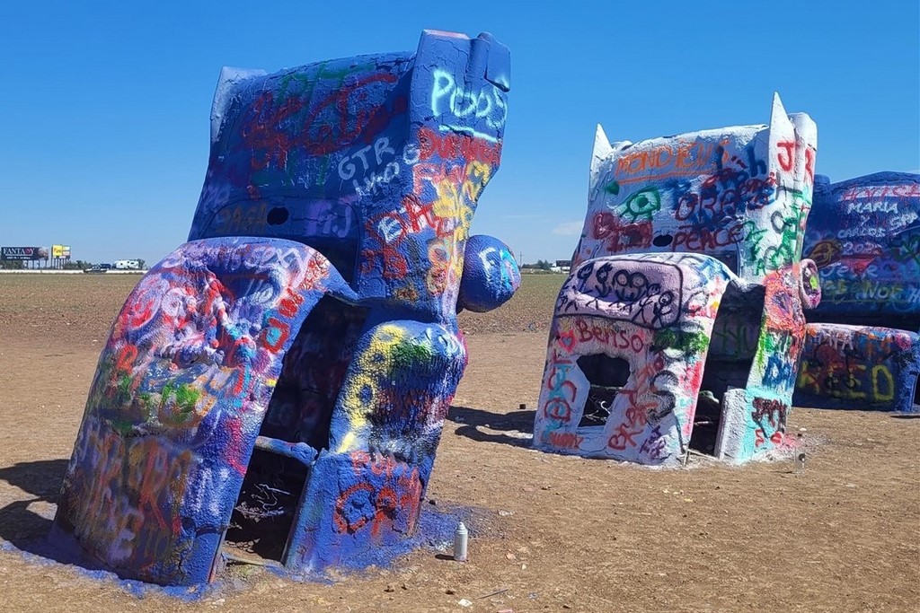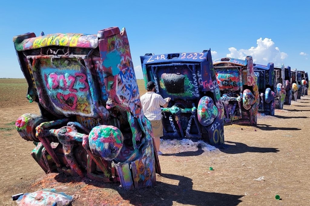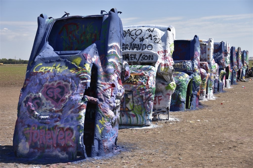 Nous rentrons au Texas et dès lors, ce sont des champs d’éoliennes à perte de vues. A Cadillac Ranch, nous découvrons dix Cadillac plantées dans le sol et les touristes s’arrêtent soit pour des photos, soit pour ajouter un petit motif à la bombe de peinture soit pour les deux. Pascal prend une bombe qui traine par terre et ajoute un petit « Poos » aux nombreux tags déjà présents. On s’immortalise mais cela ne va pas rester longtemps. Cette installation date de 1974 avec des Cadillac de 1949 à 1963.