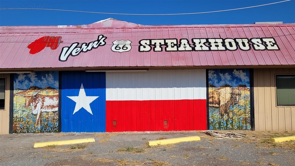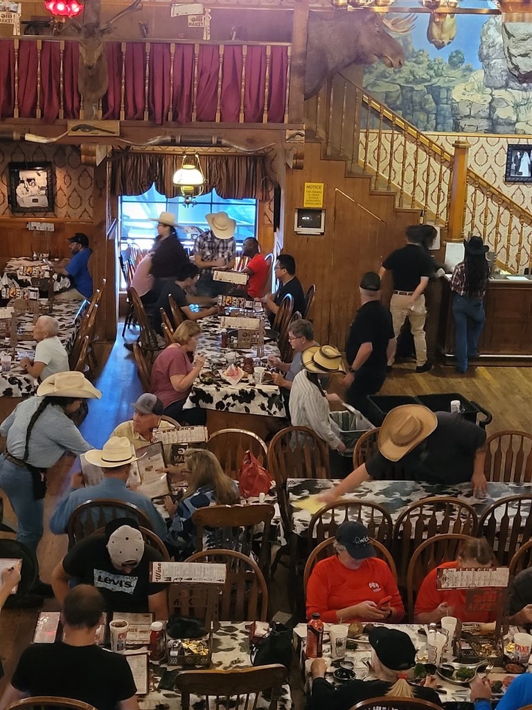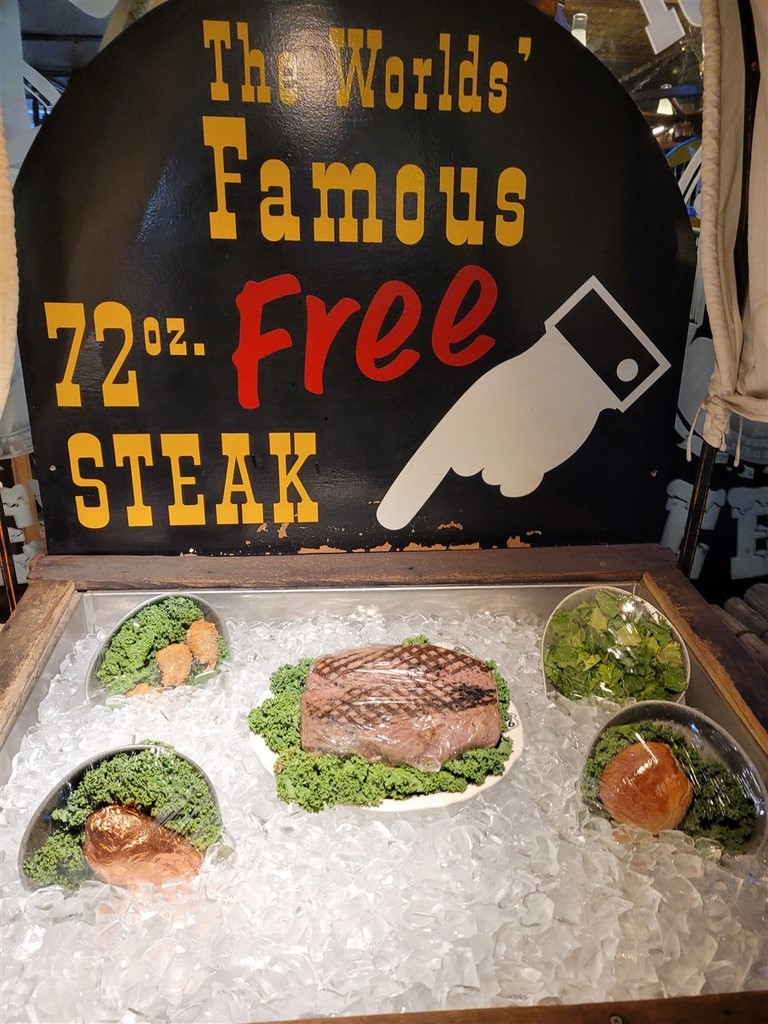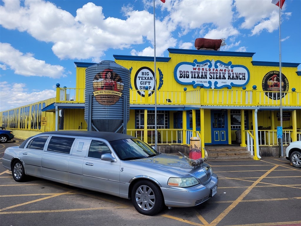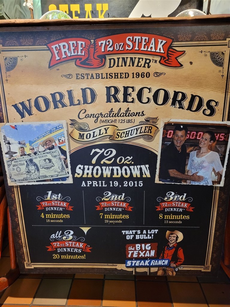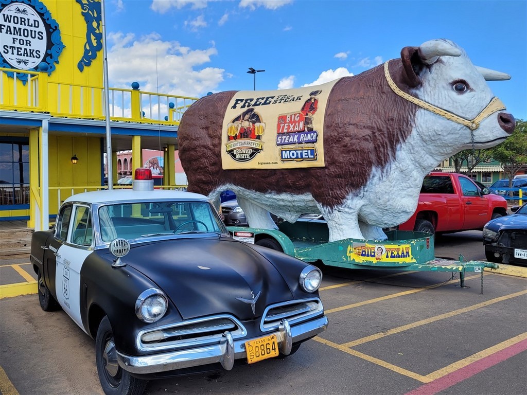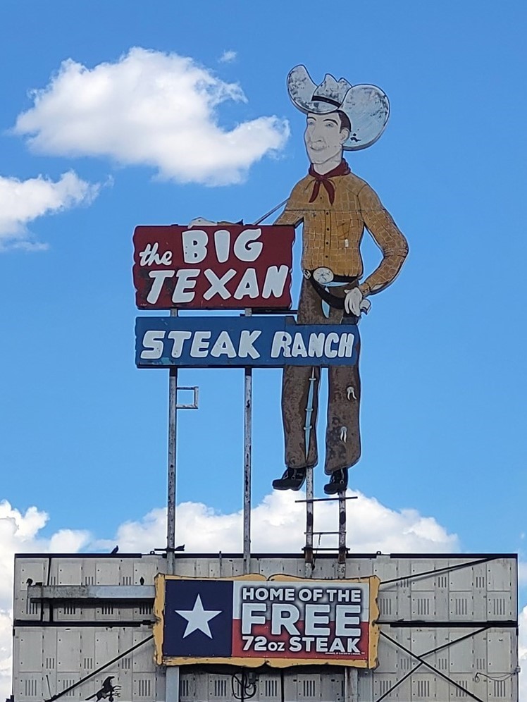 Aude et Eric, que nous avions rencontrés au Canada, nous avaient conseillés d’aller au restaurant Big Texan Steak Ranch, à Amarillo, Texas. Ce restaurant sur la route 66 est réputé car il offre le repas à celui qui mange un steak de 72oz soit 2kg, ainsi que son accompagnement, en moins d’une heure. Le top gagnant de ce défi pour l’instant l’a fait en 4min et 18s. Pascal décline l’invitation et nous paierons notre repas. De toute façon, on ne finit même pas nos deux assiettes tellement les quantités sont importantes. On terminera le soir dans le camping-car. Le personnel est habillé très typiquement, le cliché pour nous : Chapeau, chemise à carreaux, pantalon et bottes. On remarque que beaucoup d’hommes dans la salle sont habillés ainsi. Sur les murs sont accrochés des têtes de cerfs et de divers autres animaux. Un ours empaillé tout debout nous regarde entrer.