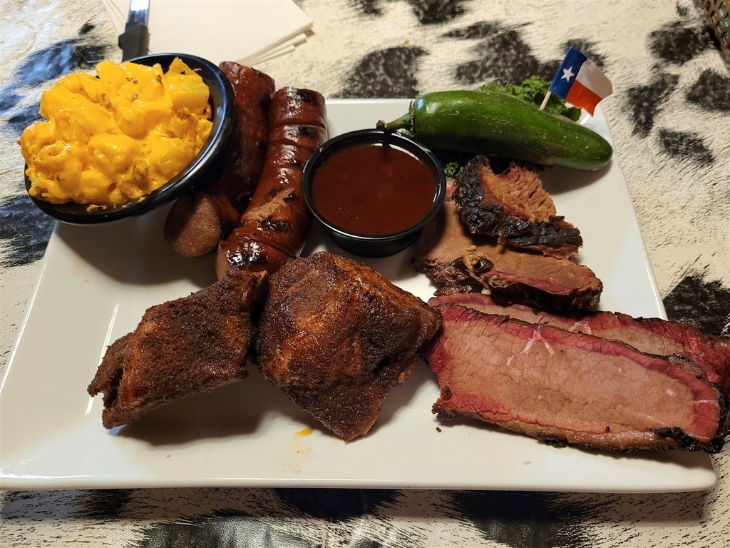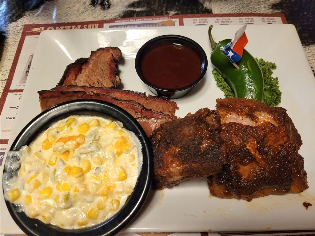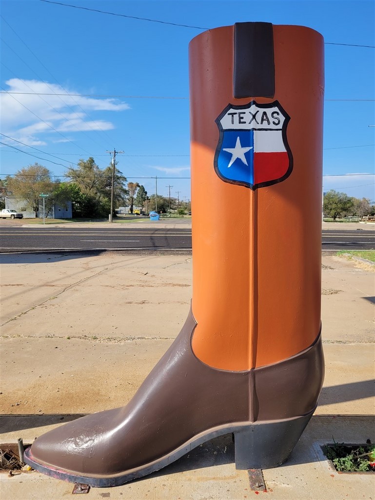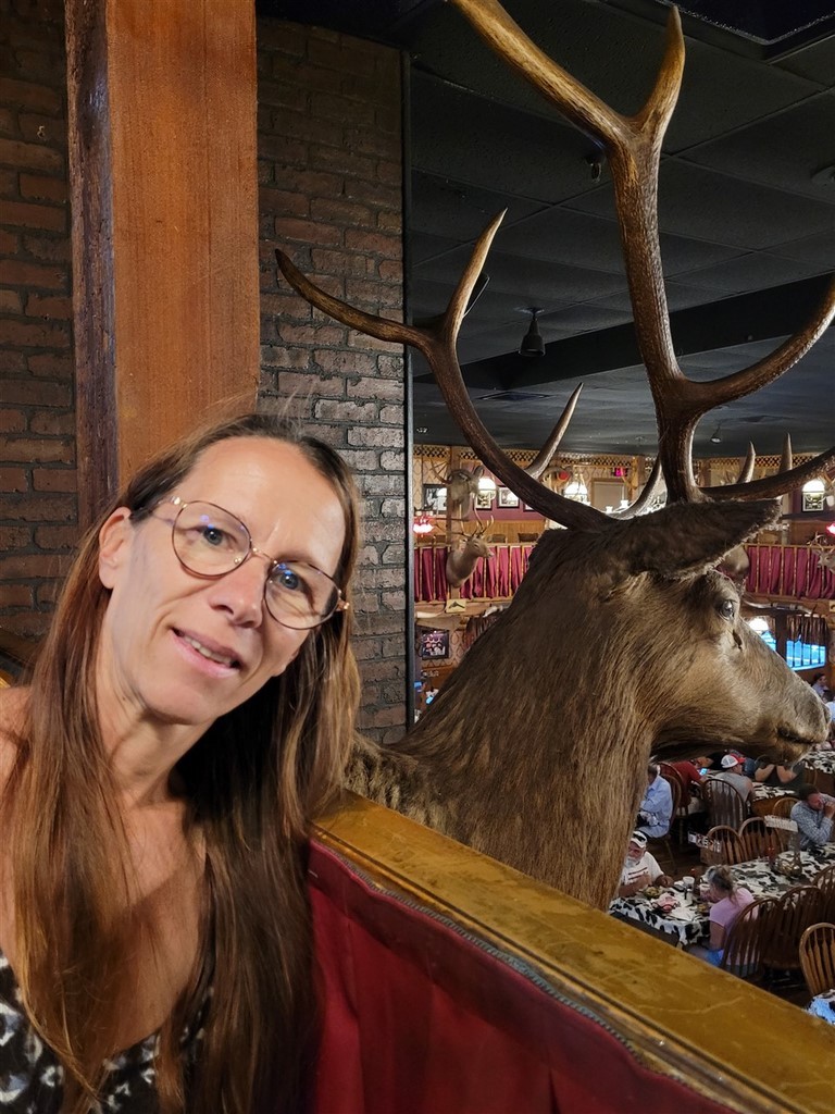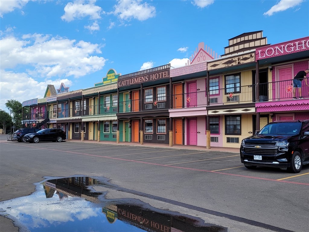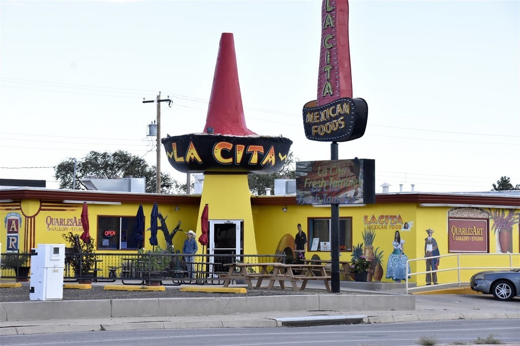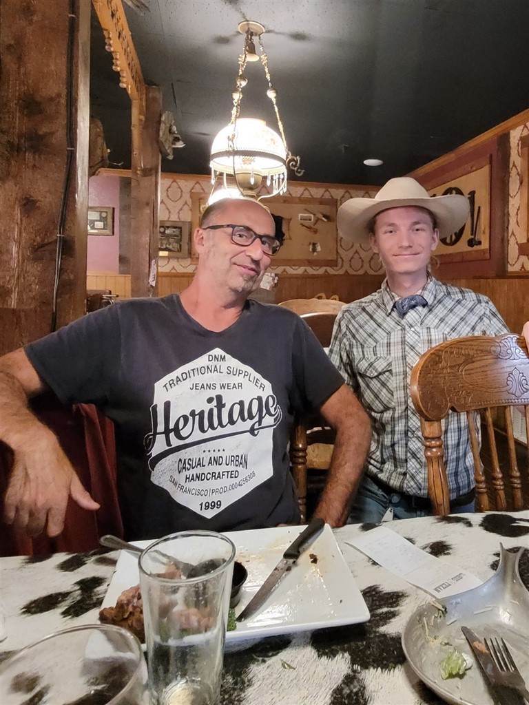 Aude et Eric, que nous avions rencontrés au Canada, nous avaient conseillés d’aller au restaurant Big Texan Steak Ranch, à Amarillo, Texas. Ce restaurant sur la route 66 est réputé car il offre le repas à celui qui mange un steak de 72oz soit 2kg, ainsi que son accompagnement, en moins d’une heure. Le top gagnant de ce défi pour l’instant l’a fait en 4min et 18s. Pascal décline l’invitation et nous paierons notre repas. De toute façon, on ne finit même pas nos deux assiettes tellement les quantités sont importantes. On terminera le soir dans le camping-car. Le personnel est habillé très typiquement, le cliché pour nous : Chapeau, chemise à carreaux, pantalon et bottes. On remarque que beaucoup d’hommes dans la salle sont habillés ainsi. Sur les murs sont accrochés des têtes de cerfs et de divers autres animaux. Un ours empaillé tout debout nous regarde entrer.