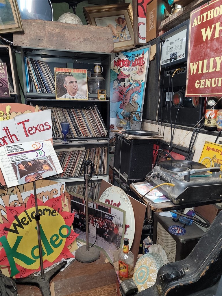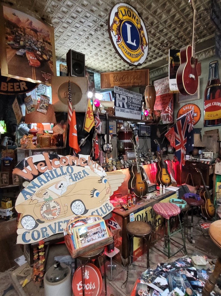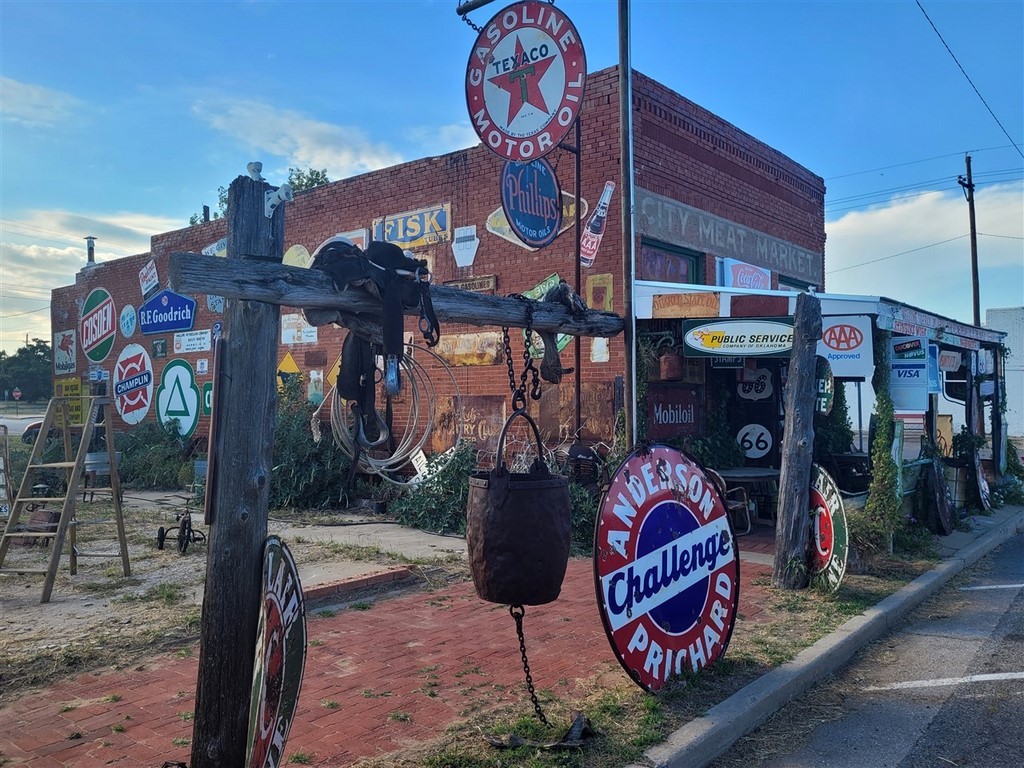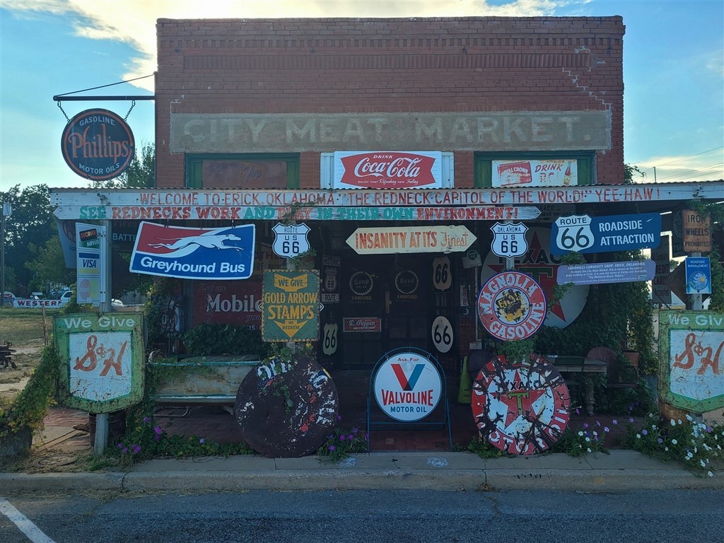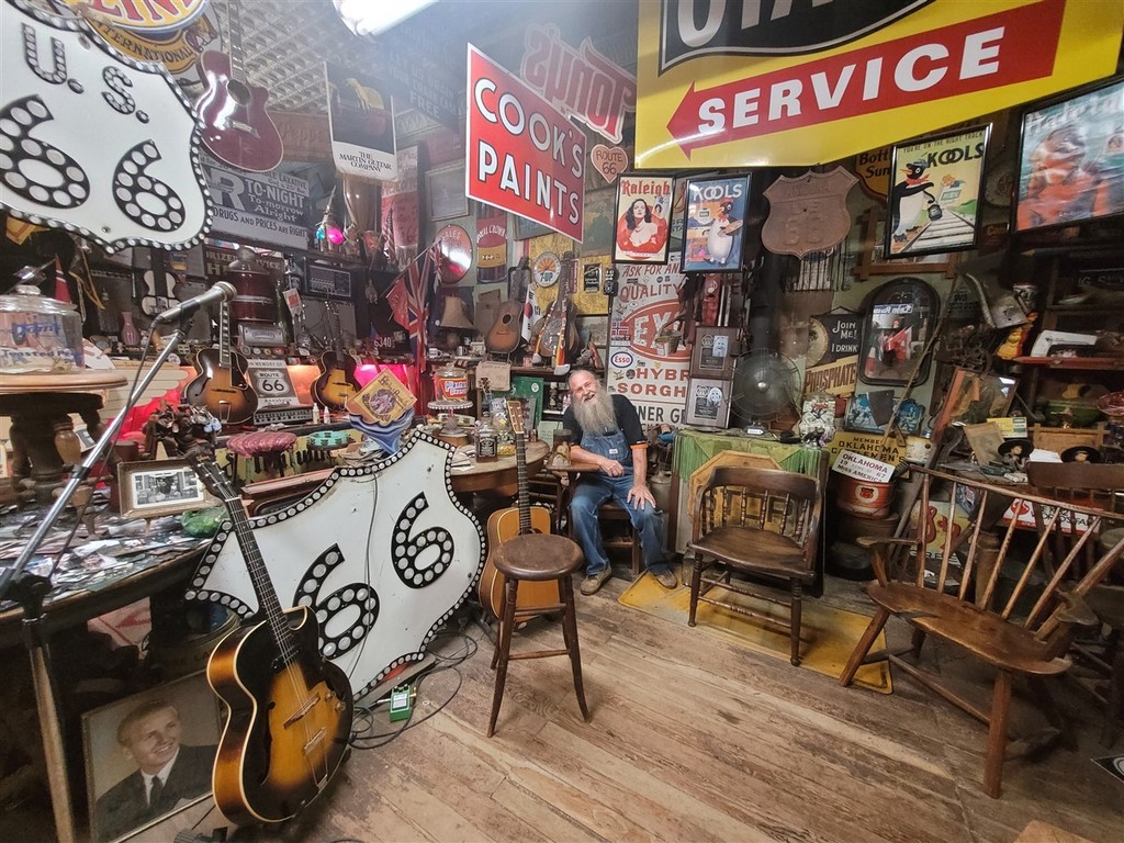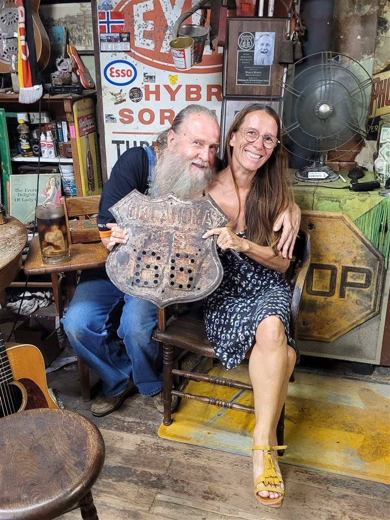 Dans la petite ville d’Erick, on s’arrête au Sandhills Curiosity Shop d’Harley Russel. Cet extravagant personnage de 77 ans, à priori, collectionne tout ce qu’il a pu trouver se rapportant à la Route 66. C’est le chantier, plus ou moins organisé, mais l’homme est drôle. Il ne vend rien, on peut prendre les photos qu’on veut. Il est tranquille dans son fauteuil, avec ses clopes, sa bouteille de Jack, et sa guitare pas loin. Il aime qu’on le prenne en photo, mais Pascale n’était pas si rassurée quand elle a été prise dans ses bras.