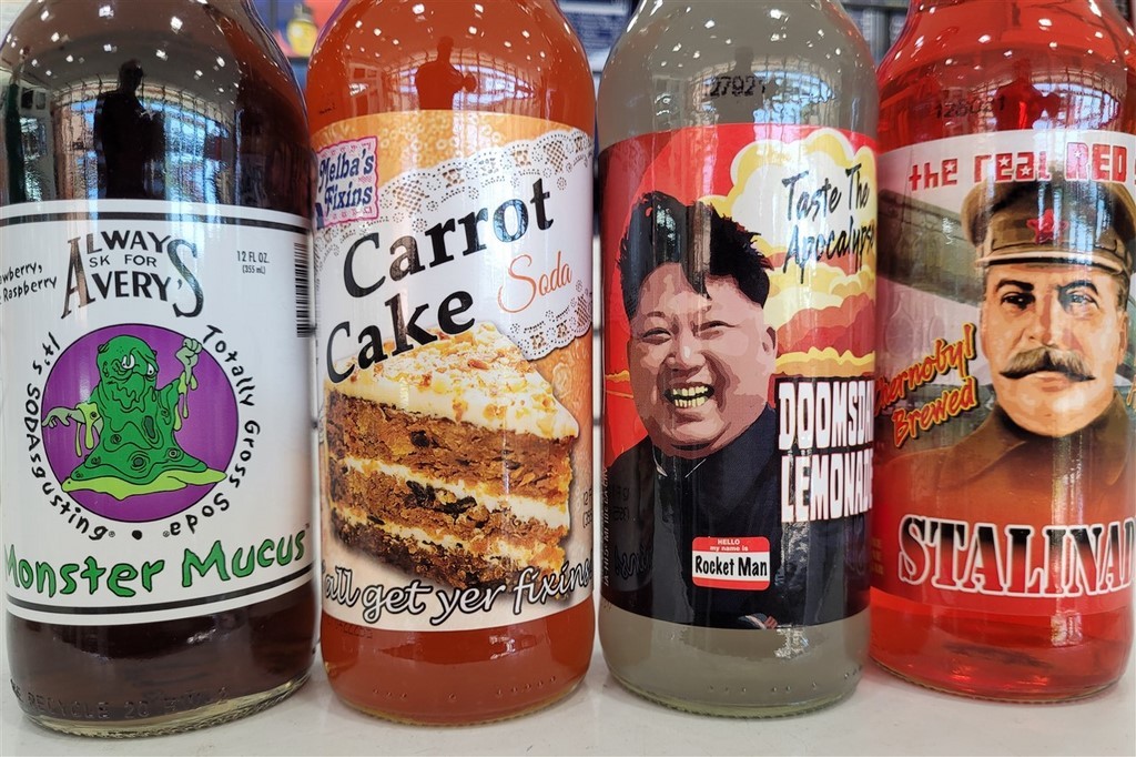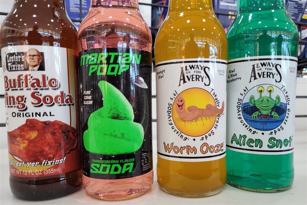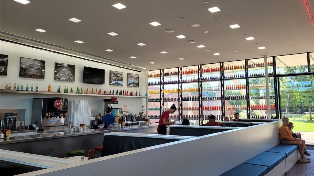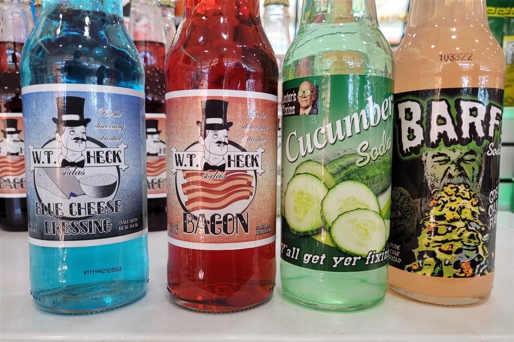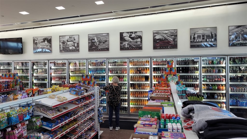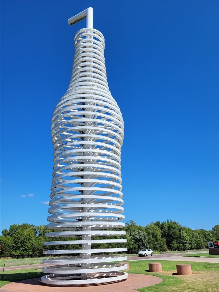 A présent dans l’Oklahoma, nous nous arrêtons à Arcadia. Nous sommes toujours sur la Route 66, et il y a un restaurant, Pop’s 66. Dans ce restaurant, on y sert 600 sortes de sodas différents. Les gouts vont du classique à l’exubérant voire dégoutant : cola, root beer, limonade, spaghetti, moutarde, beurre, fromage bleu, bacon, Staline, crotte de martien, mucus de monstre, … On a acheté des classiques, pas très téméraires pour cette fois.