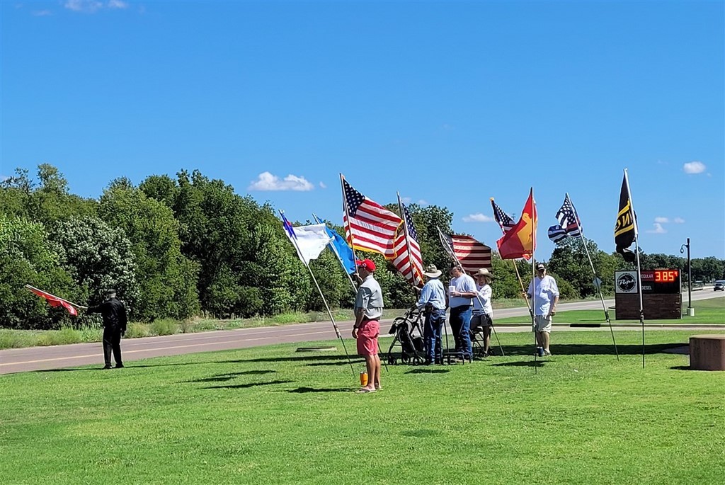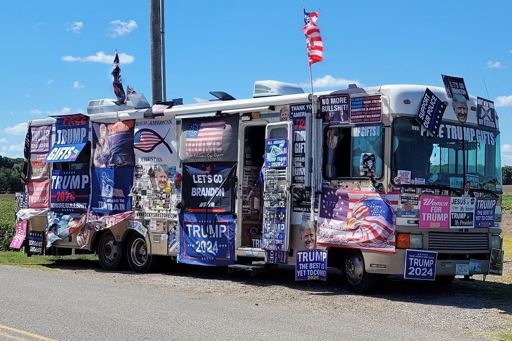 Sur le parking, on s’est fait remarquer avec le camping-car et Pascal se fait des copains. Il y a un rassemblement d’hommes et femmes, avec drapeaux américains et d’autres, et un très beau bus décoré, avec des tracts et affiches de Donald Trump. Ces gens se revendiquent comme des patriotes américains, et forcément crachent leur haine sur la politique du nouveau président. Mais ils sont intéressés sur notre voyage et questionnent beaucoup Pascal. Il craignait un peu leur discours, mais finalement, ils ne sont pas lourds et il faut savoir faire du social. Pascal se voit remettre un beau bracelet d’American Patriot, et ils nous saluent à notre départ.
