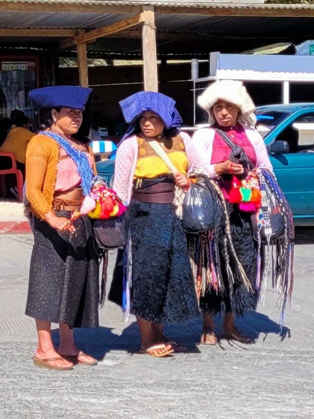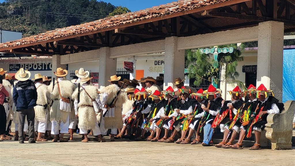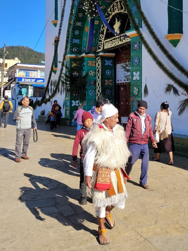 Sur la place, des tzotziles en tenue traditionnelle ou d’apparat sont réunis pour un conseil de village. Ils sont au moins une trentaine des autorités du village et d’autres personnes viennent demander conseil. On assiste impressionnés.