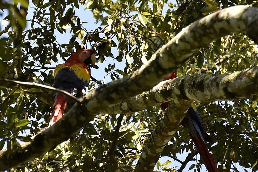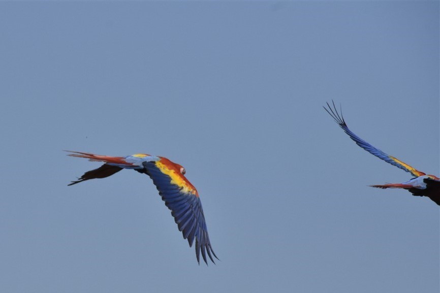 Sur la route du retour vers la lagune de Montebello, deux aras passent devant Dédé. Allez, on s’arrête à l’arrache pour prendre la photo avant qu'ils décident de repartir vite fait. On les aura vus une minute, mais ils sont grands et superbes.