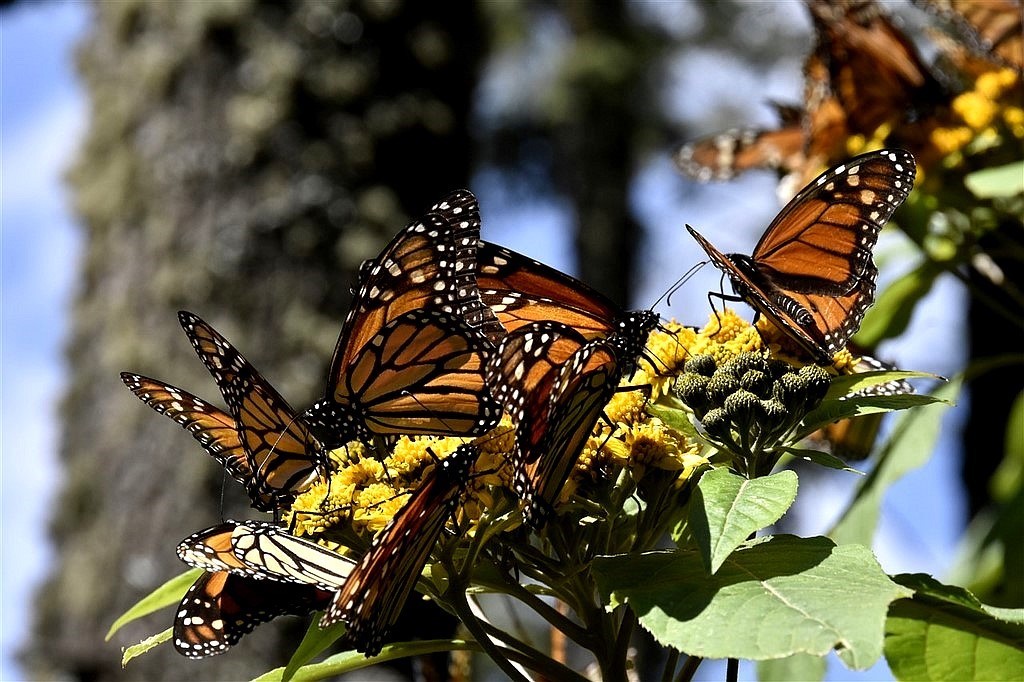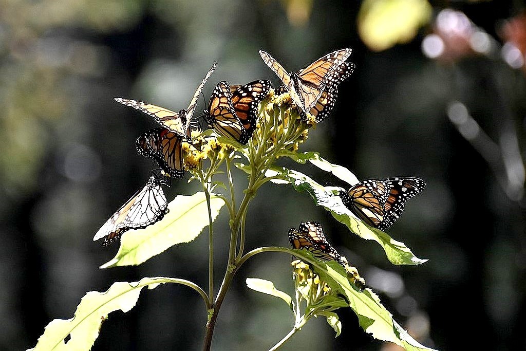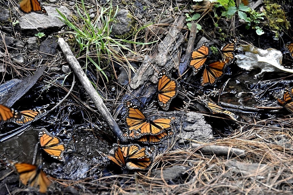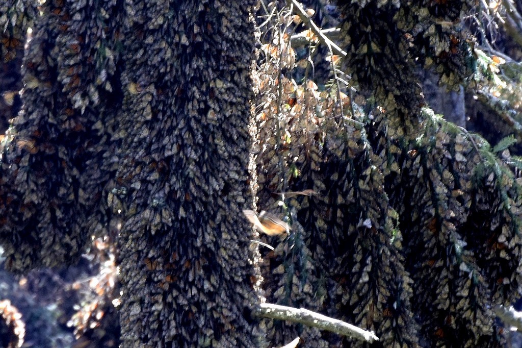 De repasser par le centre nous permet de nous arrêter au sanctuaire des papillons monarques à l’ouest de Mexico. A l’aller, ce n’était pas la saison et nous avions été déçus de ne pas les voir. La grimpette en haut de la colline permet de découvrir des centaines, non des milliers, non des centaines de millions de papillons. Rappelons que ces papillons vivent habituellement au Canada et Etats-Unis. Ils migrent sur près de quatre mille kilomètres vers cette forêt de pin de cette région du Mexique, à plus de 3000m d’altitude. Quand on dit qu’ils migrent, on compte en fait les générations car l’espérance de vie d’un papillon est de deux à trois semaines, à l’exception de la dernière qui est de huit mois. Cette génération termine la migration, se reproduit et repart vers le Nord fin mars. Il fait suffisamment chaud pour qu’ils volent par nuées, se posent sur les fleurs, le tronc des arbres ou encore viennent s’abreuver dans les flaques. C’est un coup de cœur.