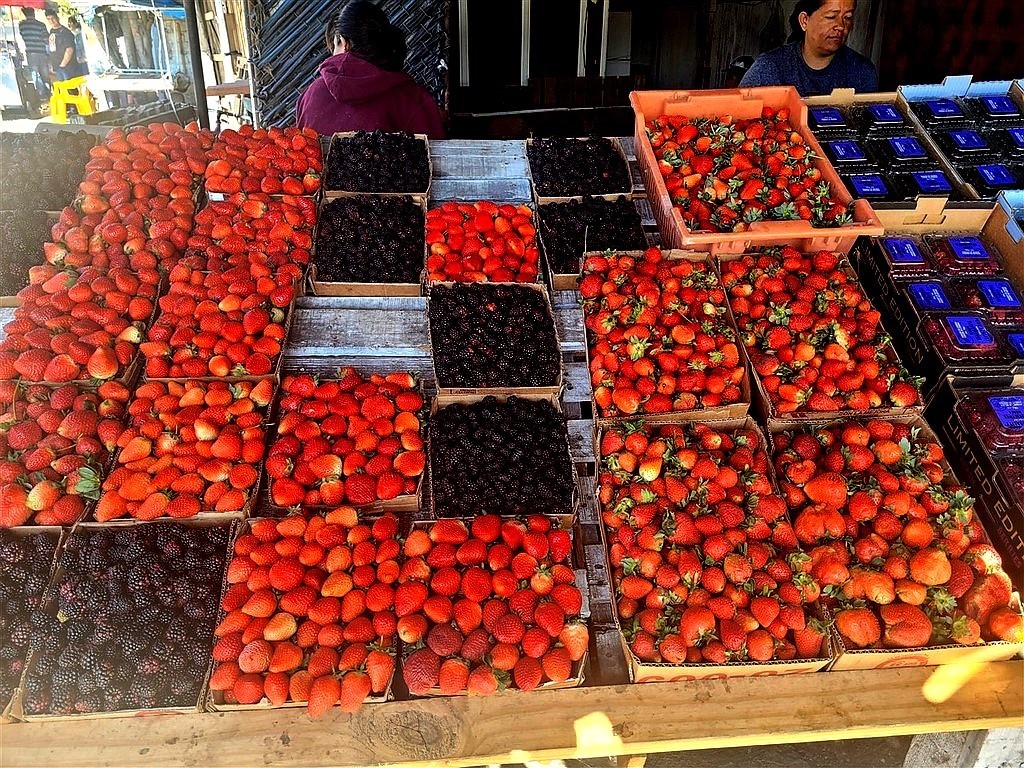 On trouve de belles surprises sur la route. Notamment quand on a autour de nous des champs de fraises pendant des kilomètres. Un stand sur le bas-côté propose des barquettes de fraises énormes : 2.5€ et il y en a plus d’un kilo.