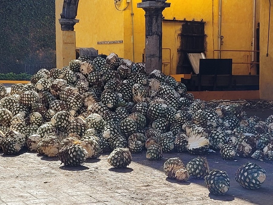 Nous choisissons la distillerie la plus vieille et mondialement reconnue, celle de Jose Cuervo. Naïfs, on pensait que la téquila était faite avec les feuilles d’agaves. Pas du tout, c’est le cœur de l’agave qui est appelé « piña » comme l’ananas, en raison de sa ressemblance. La piña est chauffée, broyée, fermentée et distillée. Pour préparer l’arrivée de nos filles dans quinze jours, nous repartons avec quelques bouteilles. Avec les bouteilles de mezcals déjà achetées quand nous étions à Oaxaca, on est paré pour leur faire goûter les spécialités locales.