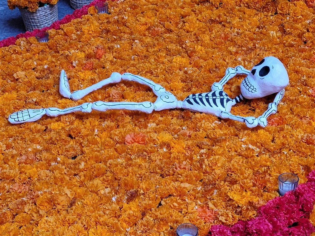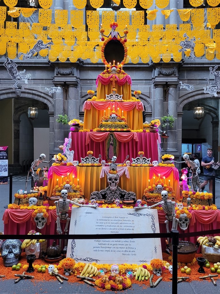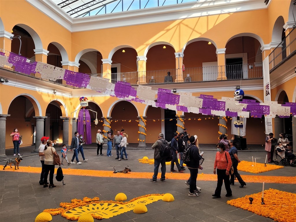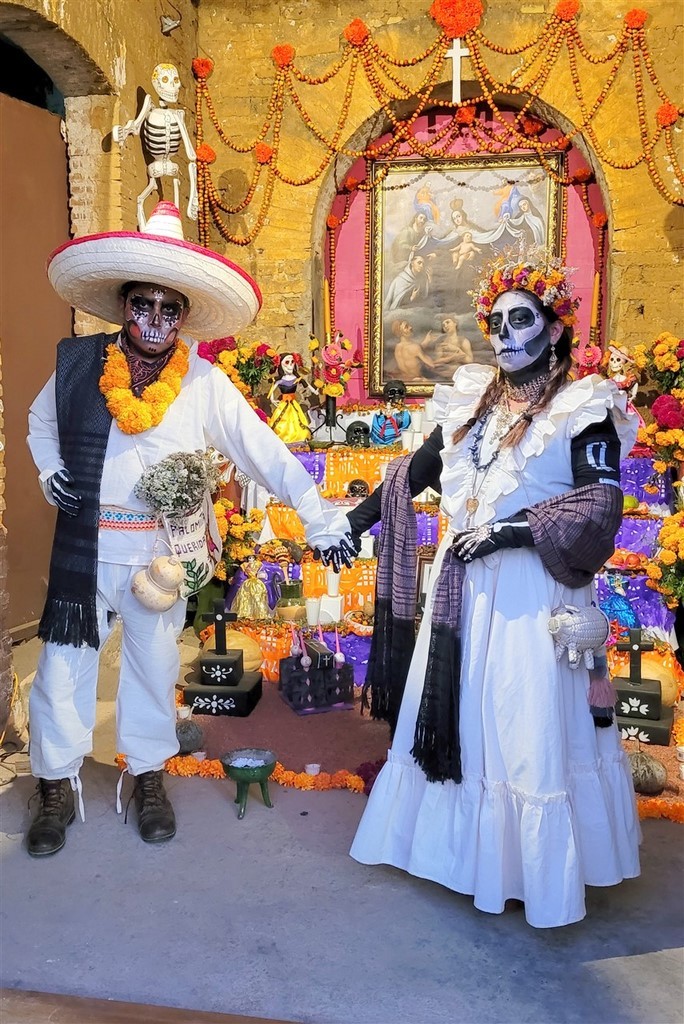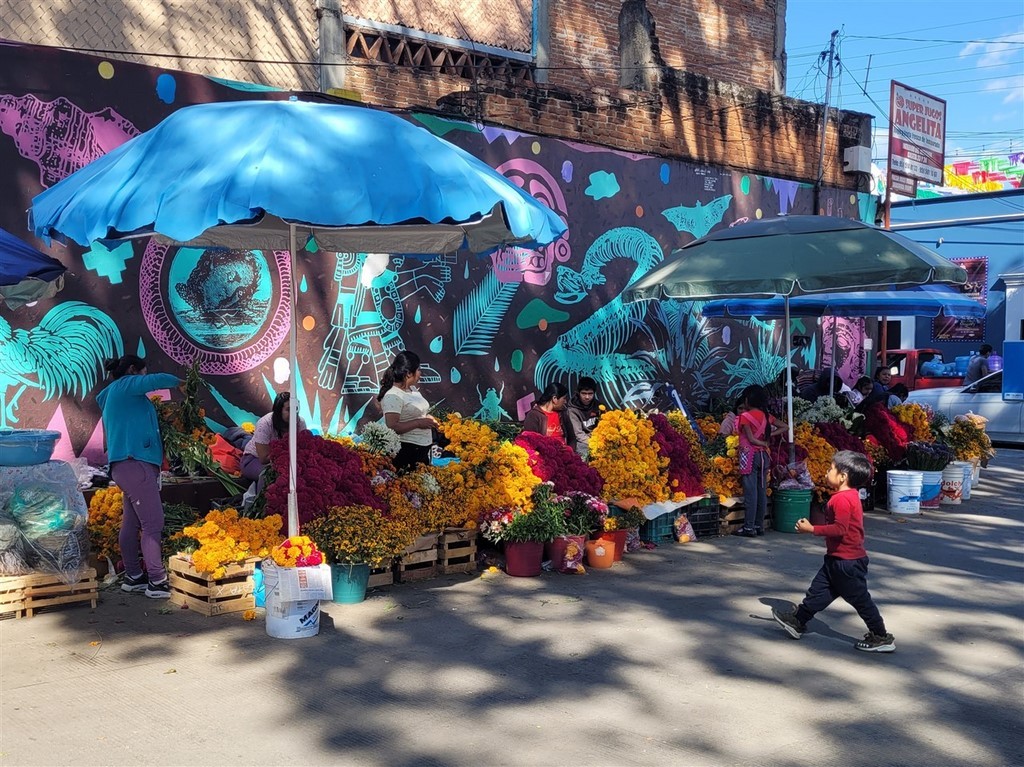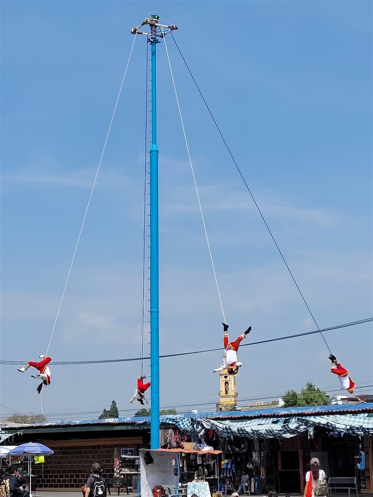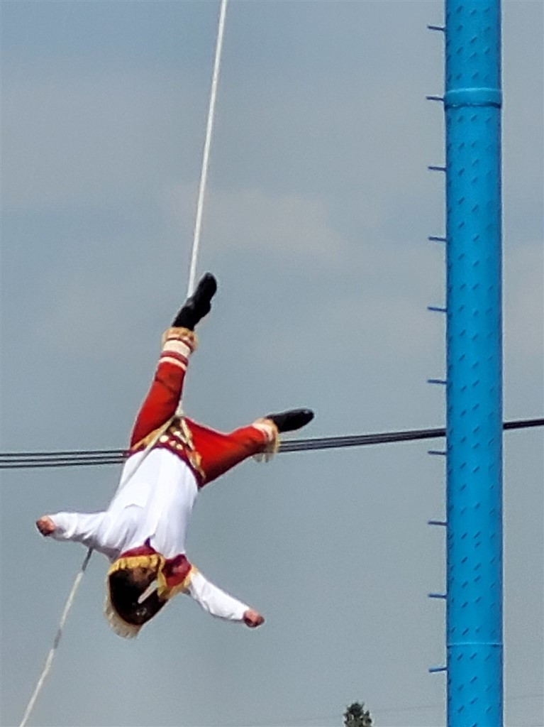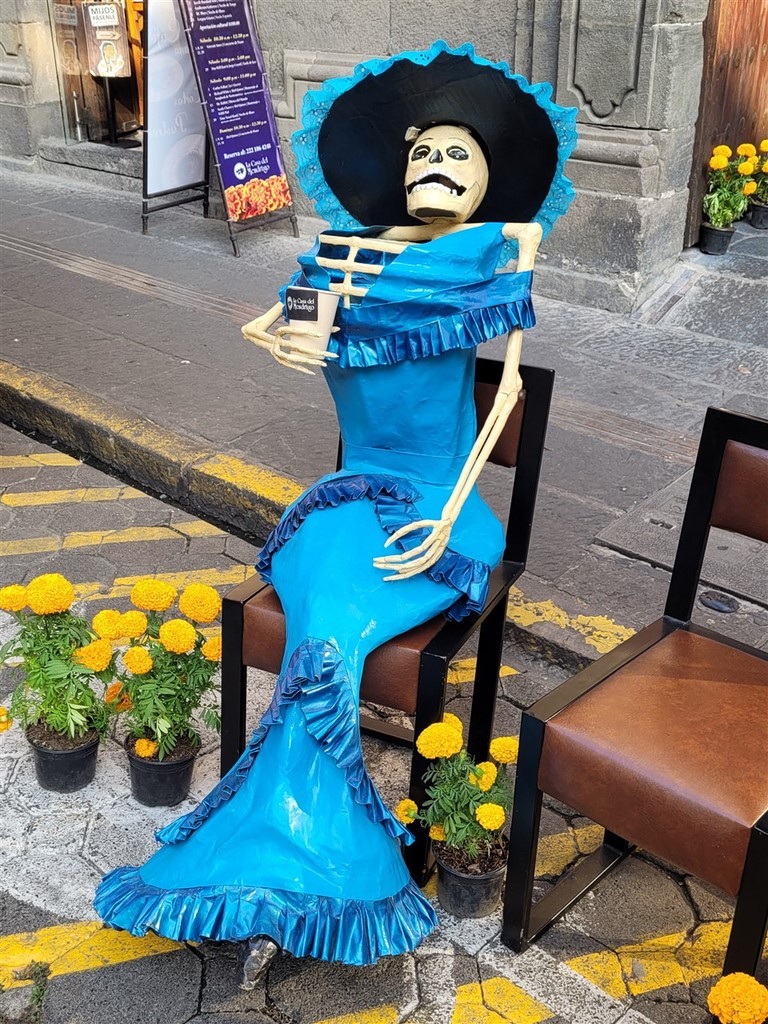 On continue notre descente vers le bas du Mexique avec Cholula et Puebla. La ville de Cholula est toute mignonne et on assiste à une démonstration de voladores. Ce sont quatre danseurs acrobates voltigeant attachés par un pied à une corde reliée en haut d’un poteau. Partout des autels ont été préparés pour le jour des morts et cela ajoute un attrait à notre visite. Les catrinas sont toutes différentes, les squelettes ont des positions différentes et c’est toujours fleuri. Il y a des photos des personnes décédées avec les objets en relation avec elles. Des fruits et le pain de la mort sont déposés.