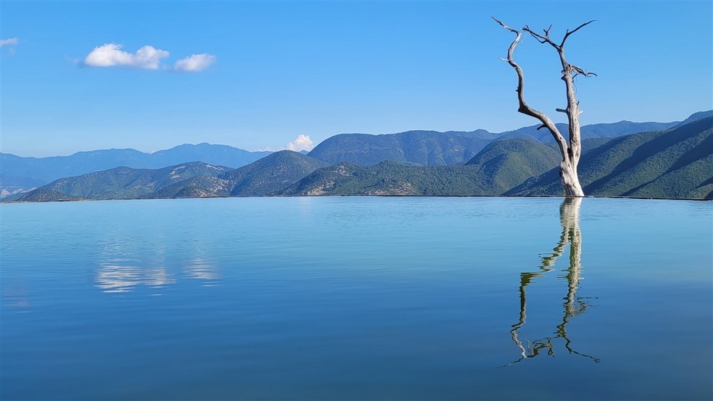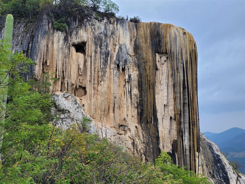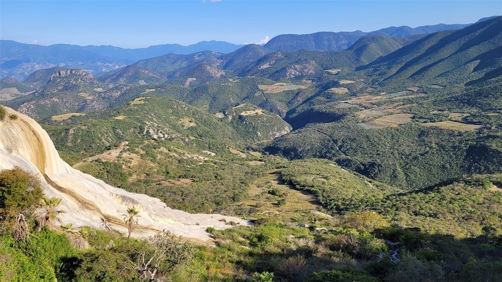 Hierve El Agua est le site des cascades pétrifiées. On nous autorise à dormir sur le parking. Nous pas gênés, nous nous parquons pour la fin de l’après-midi au bout du parking avec la plus belle vue du site, sur les vasques bleues, vertes, turquoises. Nous attendons que le nombre de visiteurs diminue pour y aller. Au bout de quelques heures, un guide nous demande de bouger, évidemment, les visiteurs ne peuvent plus prendre de photos. On est sympas, on bouge. Il y a beaucoup de monde sur le site même au coucher du soleil mais la tout petite rando permet un joli aperçu sur ces cascades pétrifiées.