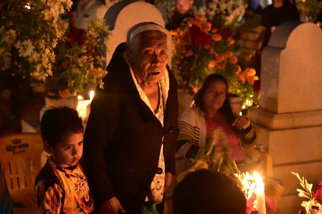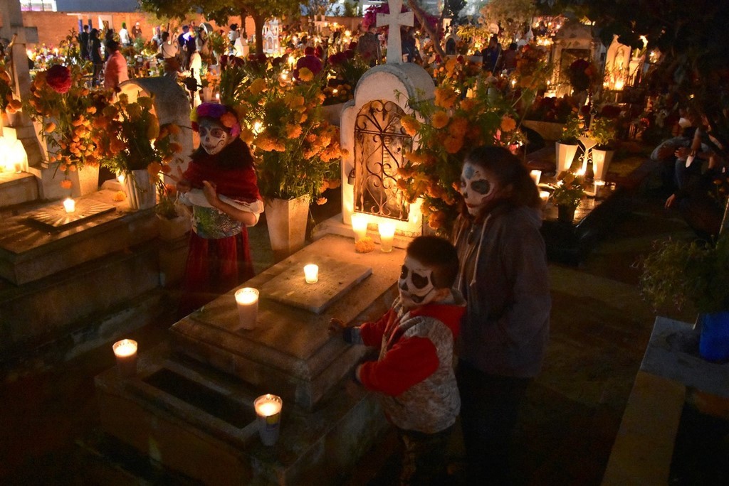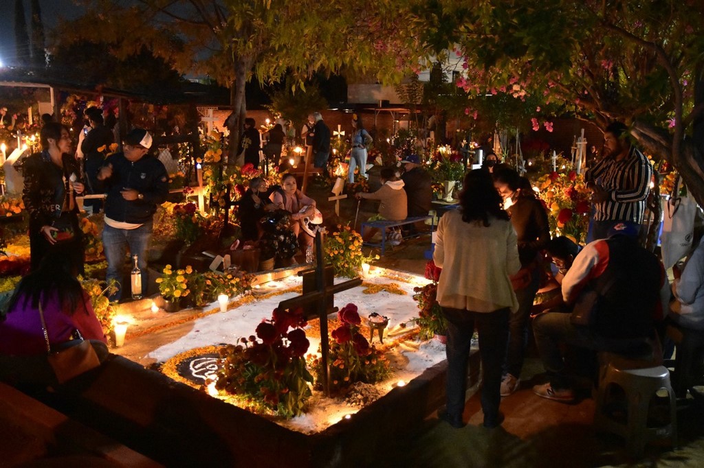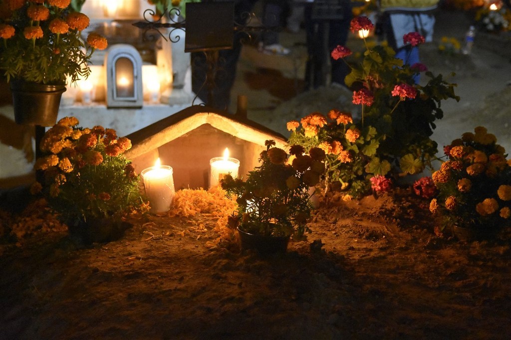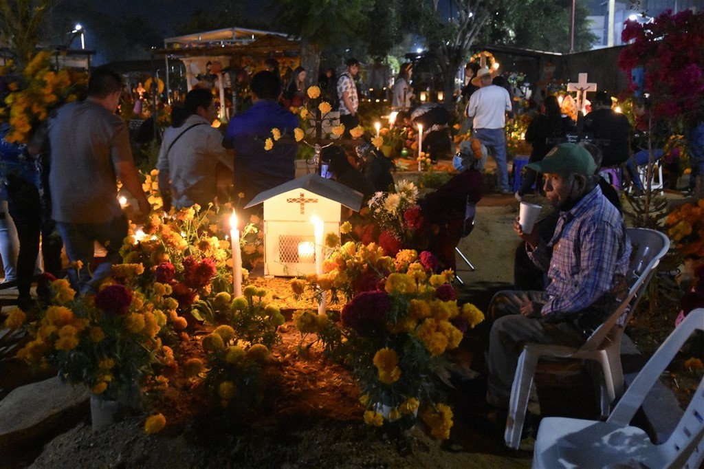 Le 31 octobre c’est le jour des morts qui se passe dans les cimetières. Nous passons la soirée à Xoxocotlan. La visite du cimetière principal est sidérante. Il y a foule. Beaucoup de locaux viennent orner les tombes de leurs proches et y passer la veillée. Il y a surtout énormément de touristes qui viennent voir cette tradition et prendre des photos. Pascal déteste cette foule qui n’a pas vraiment de respect. Les habitants ont l’habitude, et à en discuter avec certains, cela ne les dérange pas. Ils sont agréables, n’hésitent pas à parler, à sourire. Il fait nuit, l’ambiance est extraordinaire. Les tombes sont magnifiques décorées de fleurs, de crânes de sucre et bien sûr illuminées de bougies. Les familles sont sur des bancs entre eux pour plusieurs heures ou pour la nuit ou ont même amené leur chaise. Dans le cimetière se promènent des musiciens et même des marchands ambulants. Pascale est toute remuée quand elle voit des tombes correspondant à des personnes, des jeunes ou des enfants décédés cette année. Cependant, le jour des morts est une fête. Certains habitants sont même à la bière ou à la téquila. Une fillette essaie d’allumer les bougies. Les personnes âgées sont bien entendu également présentes. Certains parlent, d’autres sont sur leur téléphone. Un orchestre est devant le deuxième cimetière que nous faisons en espérant qu’il soit moins touristique. Des hommes sont en train de chanter des chants catholiques devant une statue du Christ. Ils sont pour la plupart jeunes. L’un d’entre eux a un livre dans les mains. Un autre agite de l’encens. Tous reprennent ensuite les paroles.
