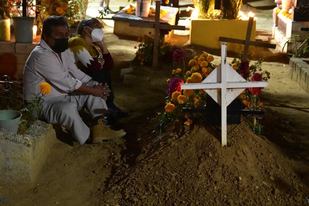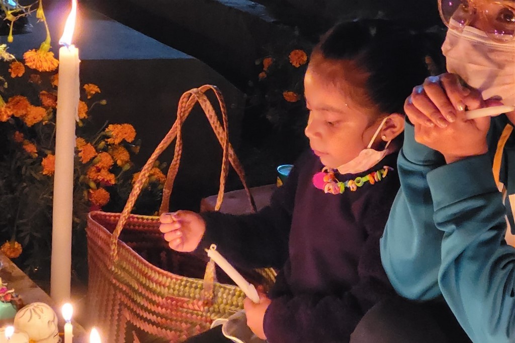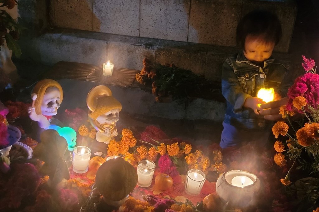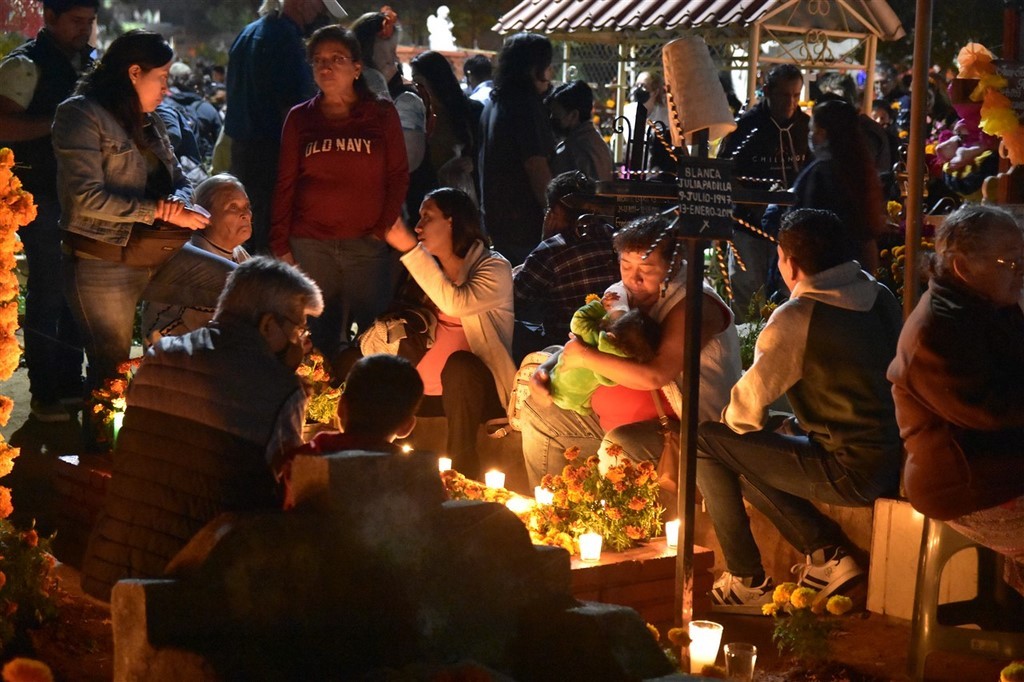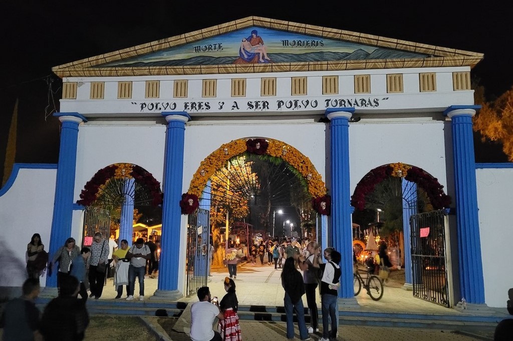 Le 31 octobre c’est le jour des morts qui se passe dans les cimetières. Nous passons la soirée à Xoxocotlan. La visite du cimetière principal est sidérante. Il y a foule. Beaucoup de locaux viennent orner les tombes de leurs proches et y passer la veillée. Il y a surtout énormément de touristes qui viennent voir cette tradition et prendre des photos. Pascal déteste cette foule qui n’a pas vraiment de respect. Les habitants ont l’habitude, et à en discuter avec certains, cela ne les dérange pas. Ils sont agréables, n’hésitent pas à parler, à sourire. Il fait nuit, l’ambiance est extraordinaire. Les tombes sont magnifiques décorées de fleurs, de crânes de sucre et bien sûr illuminées de bougies. Les familles sont sur des bancs entre eux pour plusieurs heures ou pour la nuit ou ont même amené leur chaise. Dans le cimetière se promènent des musiciens et même des marchands ambulants. Pascale est toute remuée quand elle voit des tombes correspondant à des personnes, des jeunes ou des enfants décédés cette année. Cependant, le jour des morts est une fête. Certains habitants sont même à la bière ou à la téquila. Une fillette essaie d’allumer les bougies. Les personnes âgées sont bien entendu également présentes. Certains parlent, d’autres sont sur leur téléphone. Un orchestre est devant le deuxième cimetière que nous faisons en espérant qu’il soit moins touristique. Des hommes sont en train de chanter des chants catholiques devant une statue du Christ. Ils sont pour la plupart jeunes. L’un d’entre eux a un livre dans les mains. Un autre agite de l’encens. Tous reprennent ensuite les paroles.