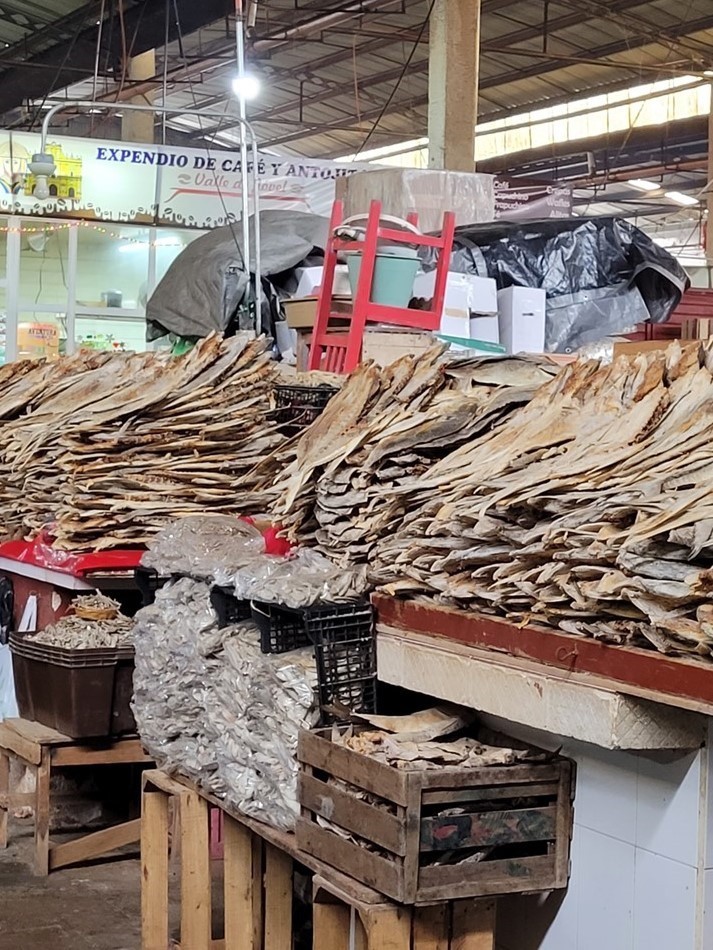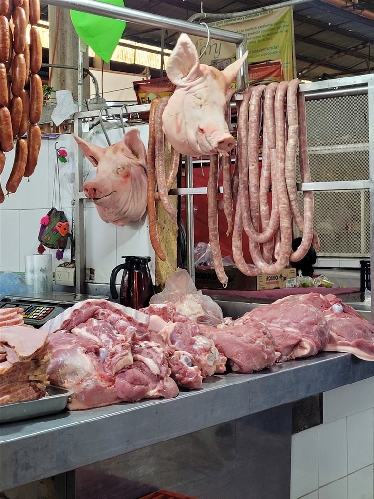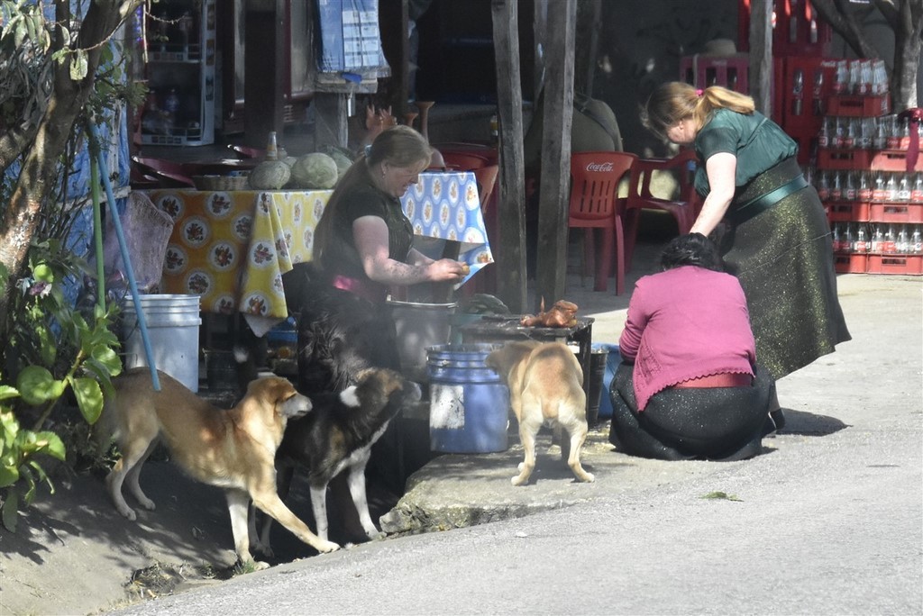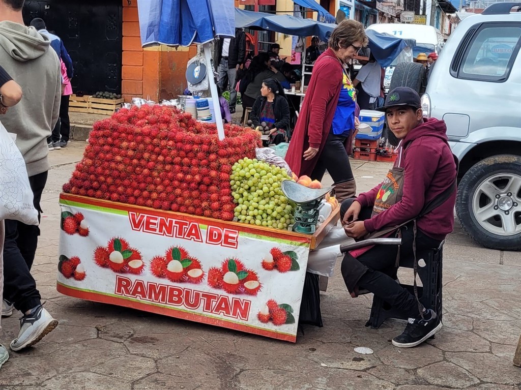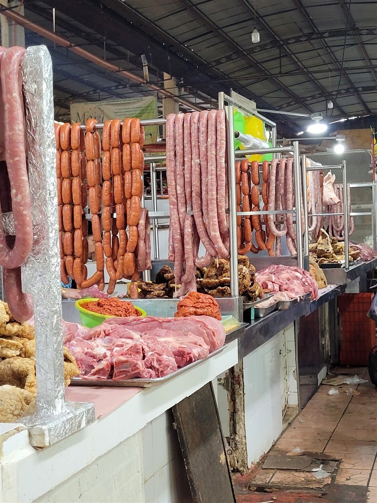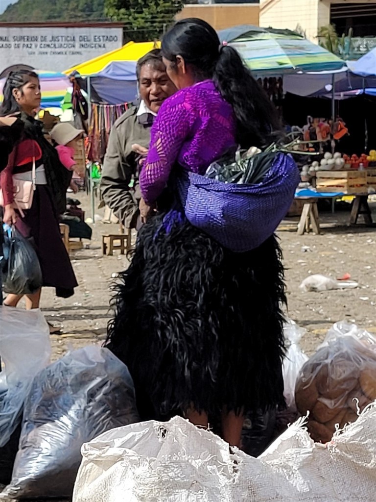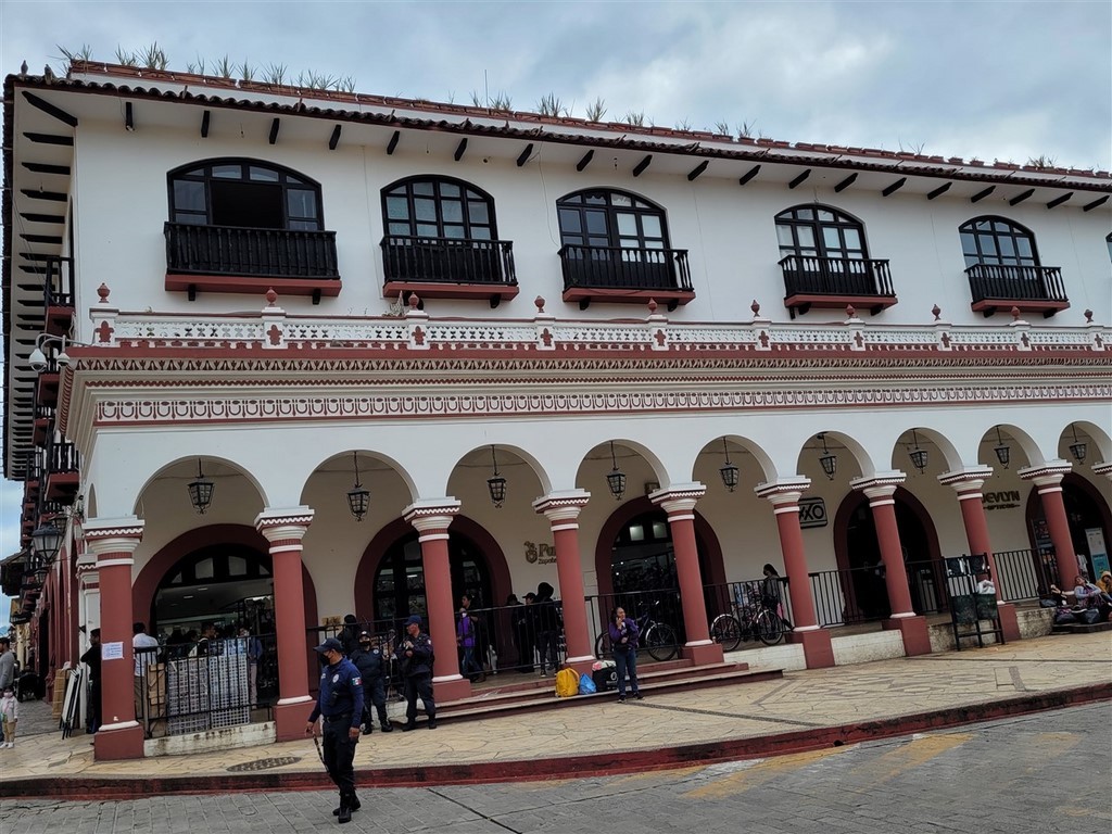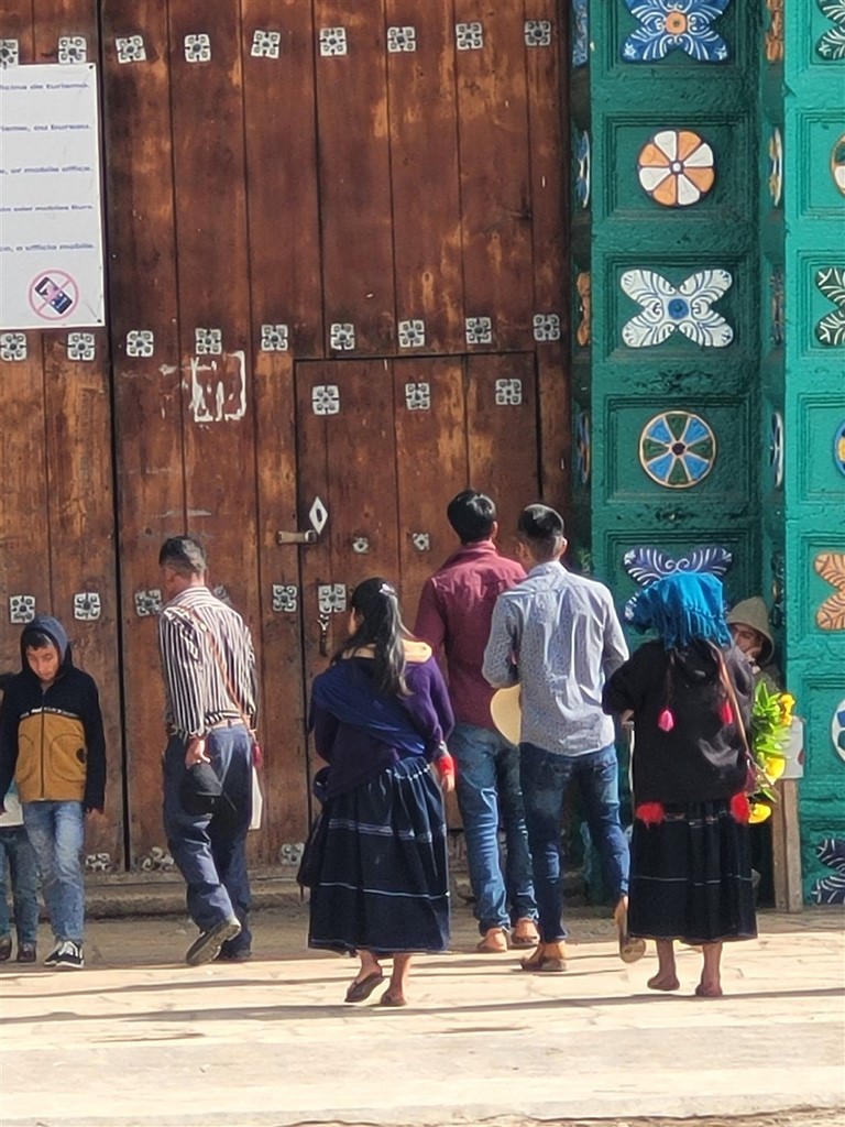 A San Cristobal de Las Casas, nous avons le plaisir de retrouver Audrey et Benji, les jeunes suisses que nous avions croisés à Oaxaca. C’est ensemble que nous découvrons le marché de San Juan de Chamula et surtout son église. C’est un village indigène tzotzile où la police n’entre pas. C’est la communauté qui fait ses propres lois. Les femmes ont des jupes en laine noire et les hommes des tuniques également grossièrement filées de laine blanche ou noire. Le marché grouille de monde, que ce soit les chamulas ou d’autres vendeurs. On y trouve aussi des stands de fruits bien rangés. Par terre, des femmes vendent de la laine grossièrement tissée comme leur jupe ou les tuniques. On peut aussi acheter des volailles. Des bobines de fil sont alignées par dizaine sur des tables. Nous pénétrons dans l’église. Nous avons bien été avertis qu’il était interdit de filmer ou de prendre des photos. Sinon, on peut se faire casser la caméra, recevoir une amende ou encore recevoir le châtiment du village soit des coups de bâton. Là, c’est un autre monde. Il n’y a aucun banc mais par terre et sur des tables, le long des murs, des centaines de bougies allumées. Quand elles sont par terre, des familles prient et murmurent des incantations. Le sol est recouvert d’aiguilles de pin. Nous voyons un homme qui s’occupe de gratter la cire avec une spatule ou de vérifier que les aiguilles de pin sont assez loin des bougies. Ici le dernier prêtre a du quitter le village en 1867 et un évêque vient une fois par an pour les baptêmes. La communauté tzotzile pratique sa propre religion mélangée à une espèce de catholicisme. Le Christ a été remplacé par San Juan portant dans ses bras un mouton, l’animal sacré des tzotziles. Nous regardons, scotchés, avec une furieuse envie de prendre des photos. Un coq se trouve près d’un groupe. Il ne bouge pas. Un guérisseur ou un chaman effectue une cérémonie pour guérir les personnes. Nous apprendrons plus tard que la cérémonie se terminera par le sacrifice du coq.