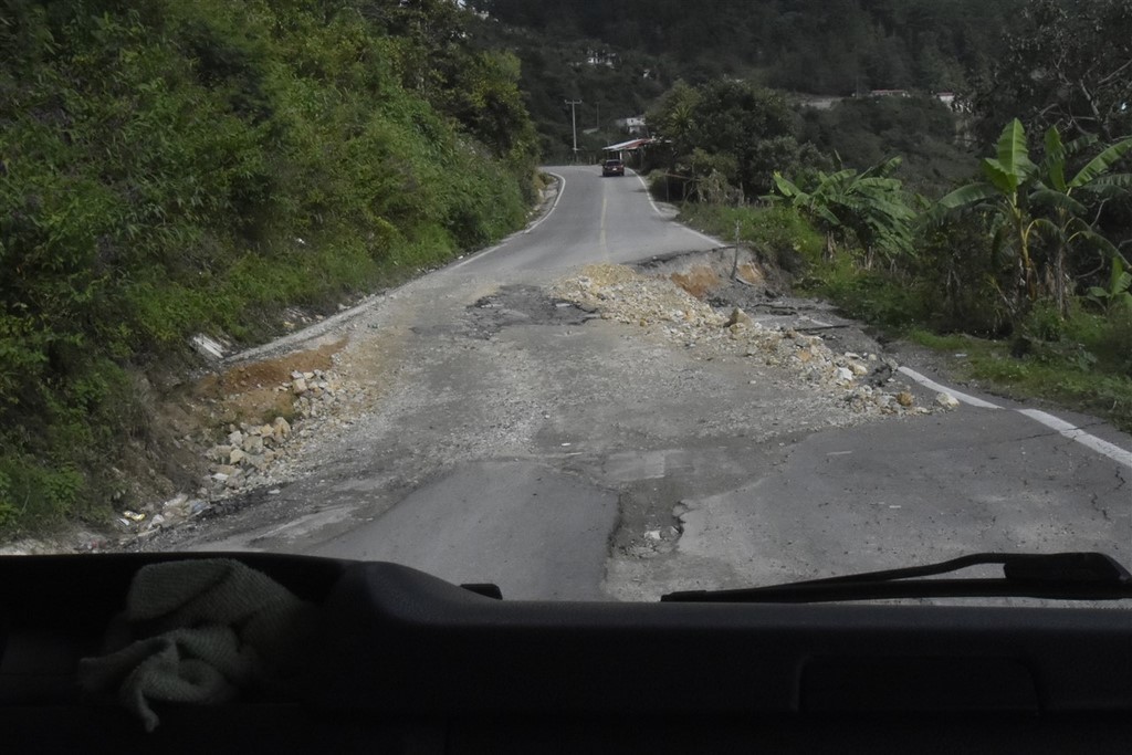 Pour aller au site archéologique de Palenque, nous faisons un grand détour. La route directe entre San Cristobal et Palenque n’est pas recommandée en raison de tensions entre la population locale qui est zapatiste et le gouvernement. D’après des voyageurs, la route serait plus sûre à présent. Mais Pascal discute avec des taxis, des personnes de l’office du tourisme, des gens de restaurant ou bien même la personne chez qui nous bivouaquons, tous nous recommandent d’éviter cet axe. Après tout, nous ne sommes pas spécialement pressés, et ayant vécu ce type de blocages en Bolivie il y a treize ans, on n’a certainement pas envie de revivre cette situation. La route que nous empruntons est tout de même très pittoresque.