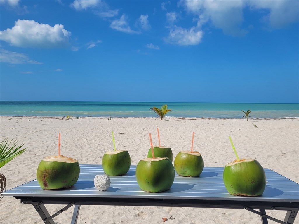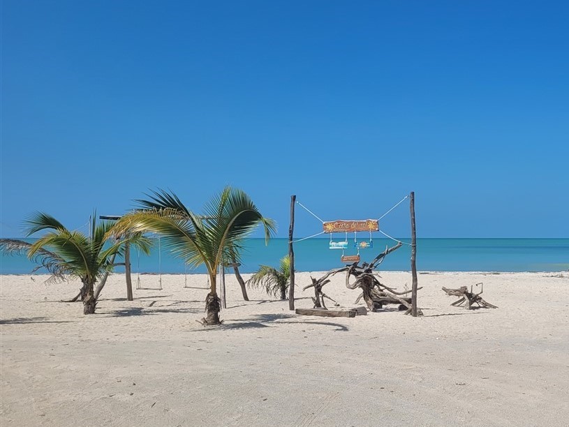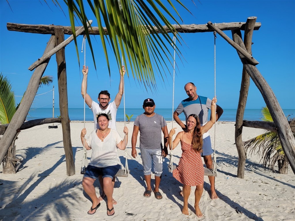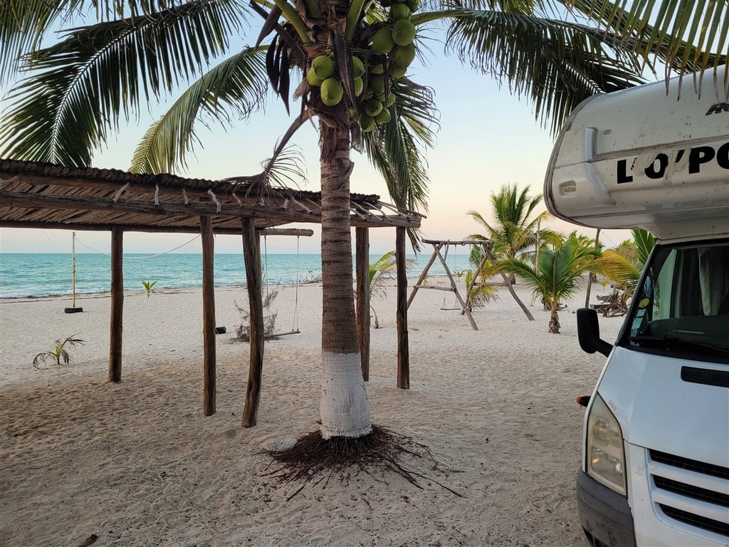 Dédé recommence à faire des siennes. Tout d’abord la deuxième batterie cellule chauffe. Elle est sous le siège de Pascale et Pascal l’arrête à temps avant qu’elle n’explose. Ouf ! Un changement s’impose. Un bruit au niveau du moteur a commencé à s’entendre quand Pascal accélère. On menace Dédé d’aller au garage Ford le plus près mais il a compris il arrête et nous emmène jusqu’au magnifique camping de Bentura à Champotón dans le golfe du Mexique avec cocotiers, balançoires, palapas et nous tout seuls. Nos amis Karelle et Franck viennent nous y rejoindre. Encore quelques jours mais il faut bien partir, nos copines vont arriver à Cancun d’ici peu.
