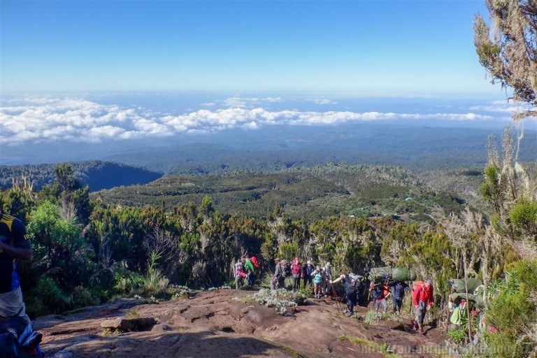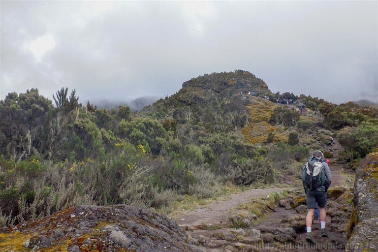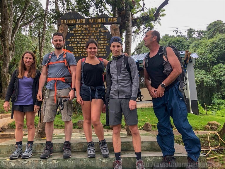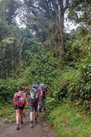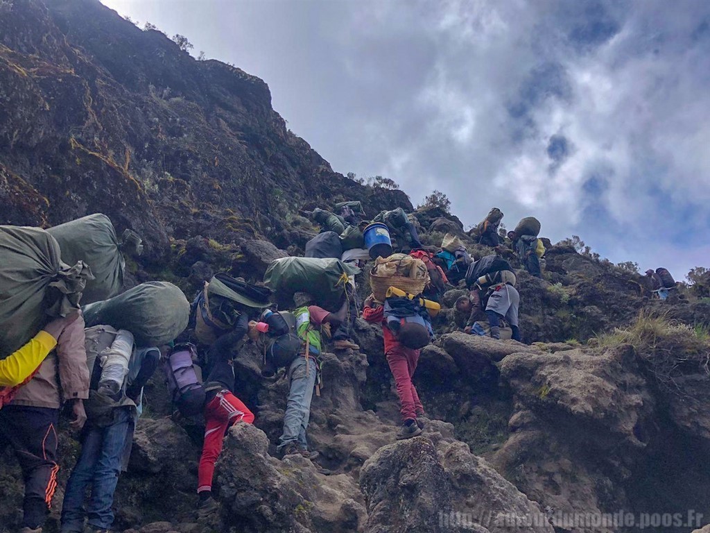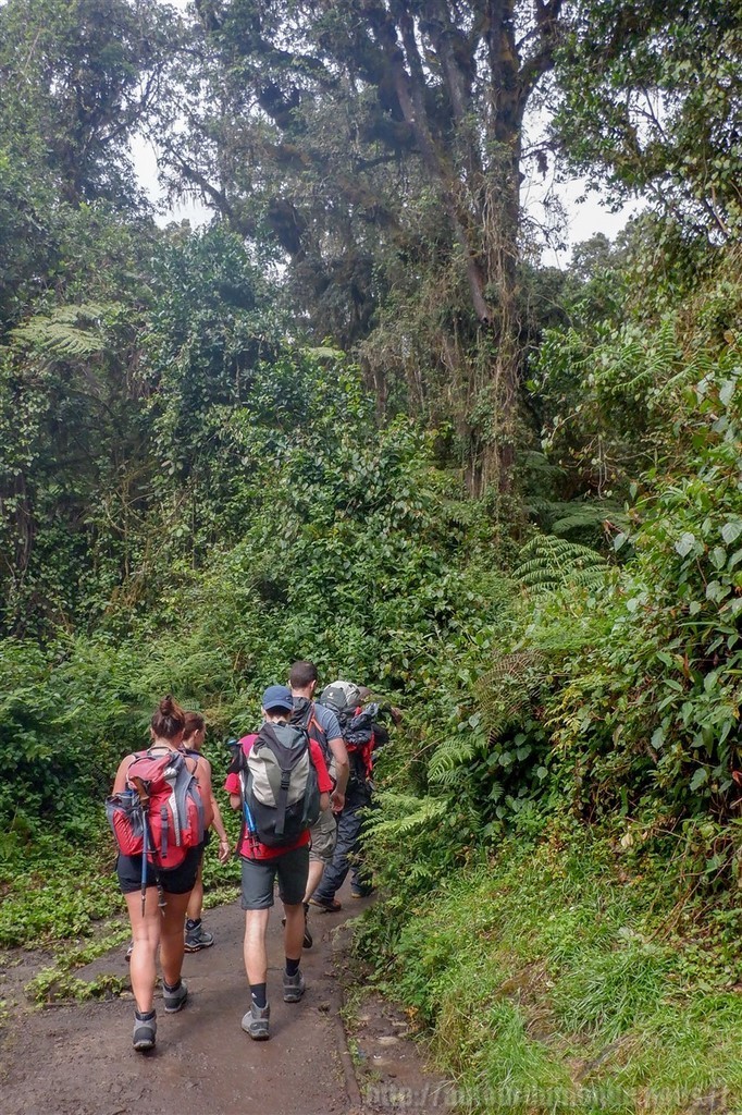 C’est alors le départ en minibus pour la porte de départ du trek, la porte Machame. On s’enregistre auprès des instances locales et au moment de partir la pluie arrive. Nous mettons cape et pantalon de pluie. La pluie était la hantise de Pascal. Au moment de décoller la pluie stoppe et nous pouvons commencer notre ascension dans la chaleur et le gris. Finalement, nous n’aurons que quelques gouttes de pluie tout au long du périple et encore nous étions sous nos tentes.