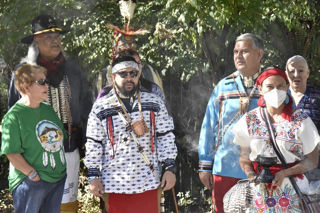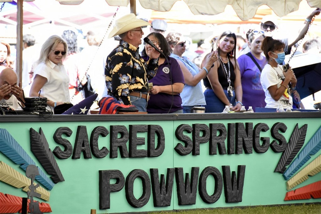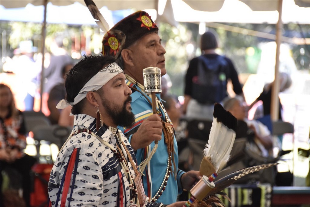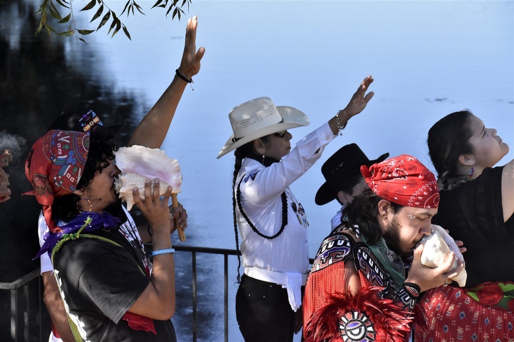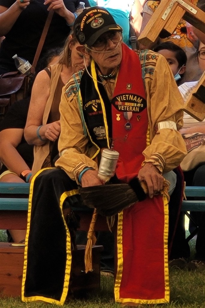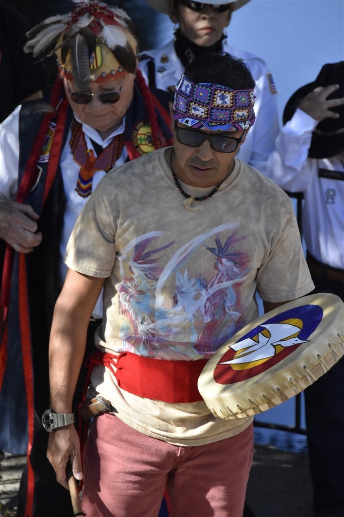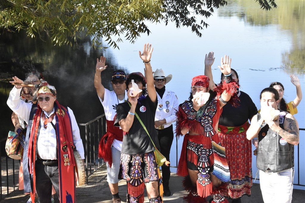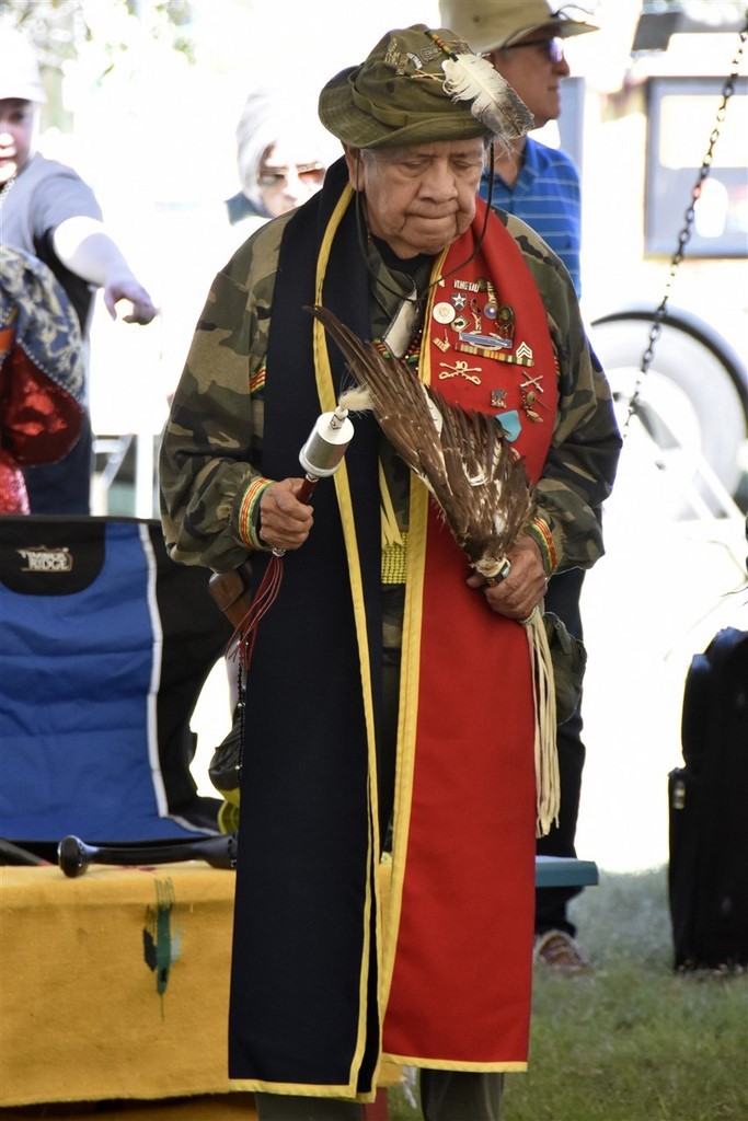Le Pow Wow commence par la bénédiction sur les rives de la rivière sacrée par le maître de cérémonie qui est de la tribu Osage. Nous sommes scotchés. Après son discours, les Indiens qui le souhaitent sont invités à chanter. Les chants sont émouvants. Ce qui nous parait bizarre, c’est qu’ils n’ont pas tous le facies qu’on imaginerait de l’indien, certains sont vraiment blancs de peau. Viennent ensuite trois aztèques qui soufflent dans un coquillage vers les quatre points cardinaux, puis vers le ciel et enfin la terre. Toute l’assistance suit le mouvement, se tourne de chaque côté. Nous en avons des frissons.