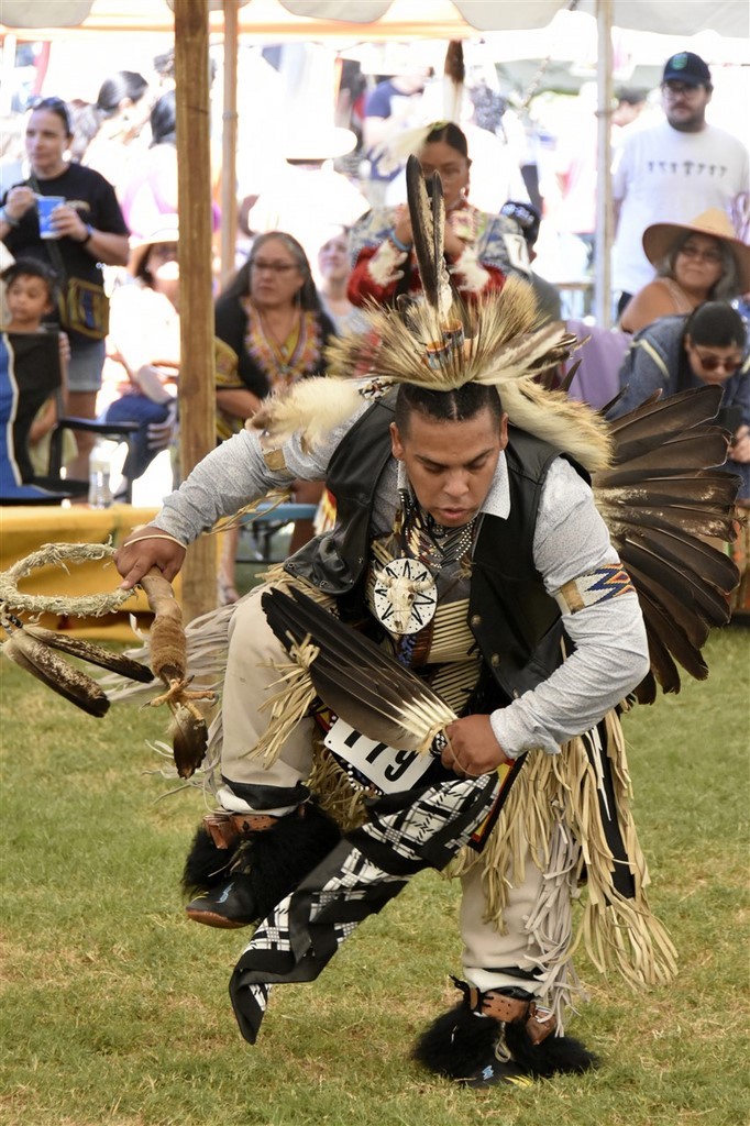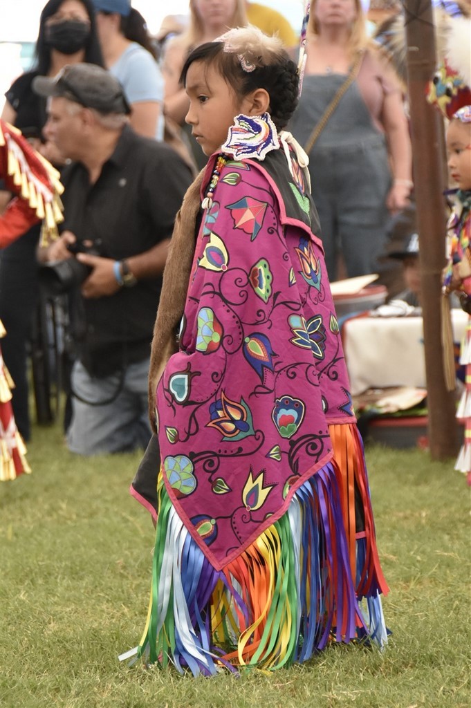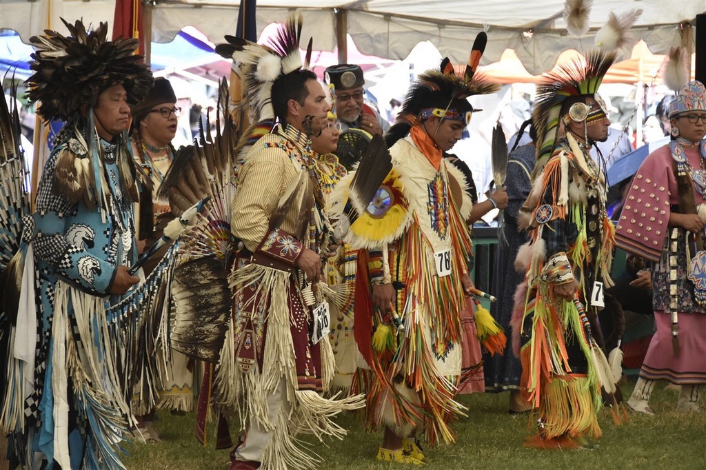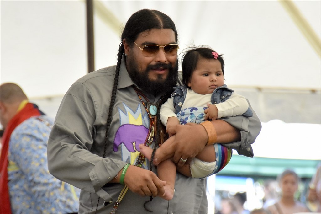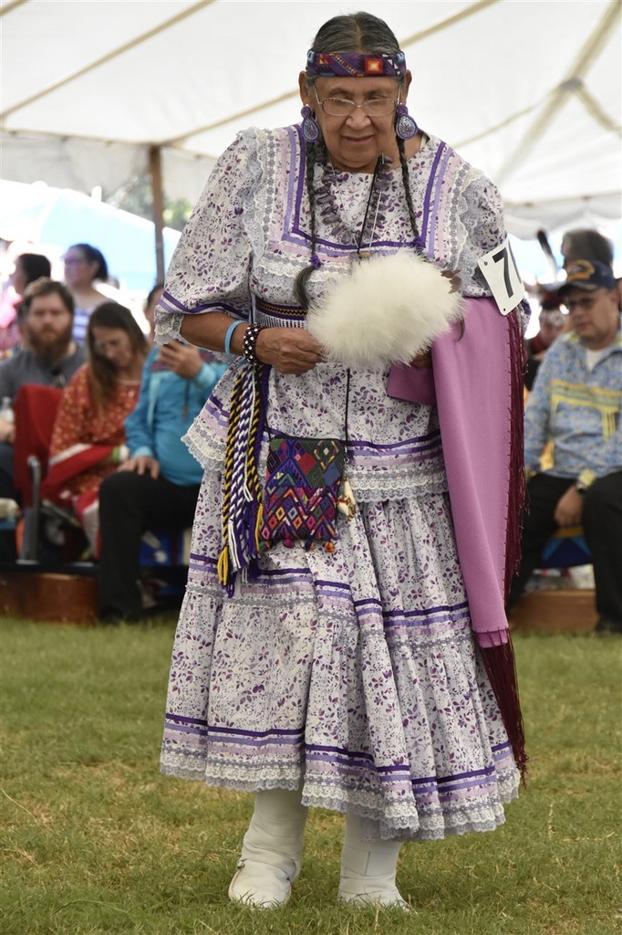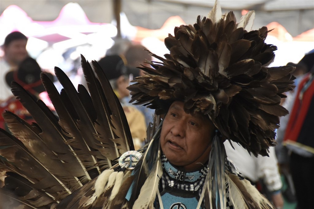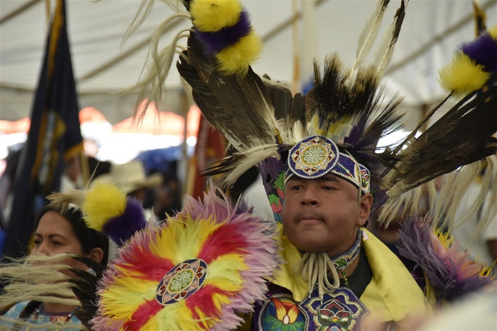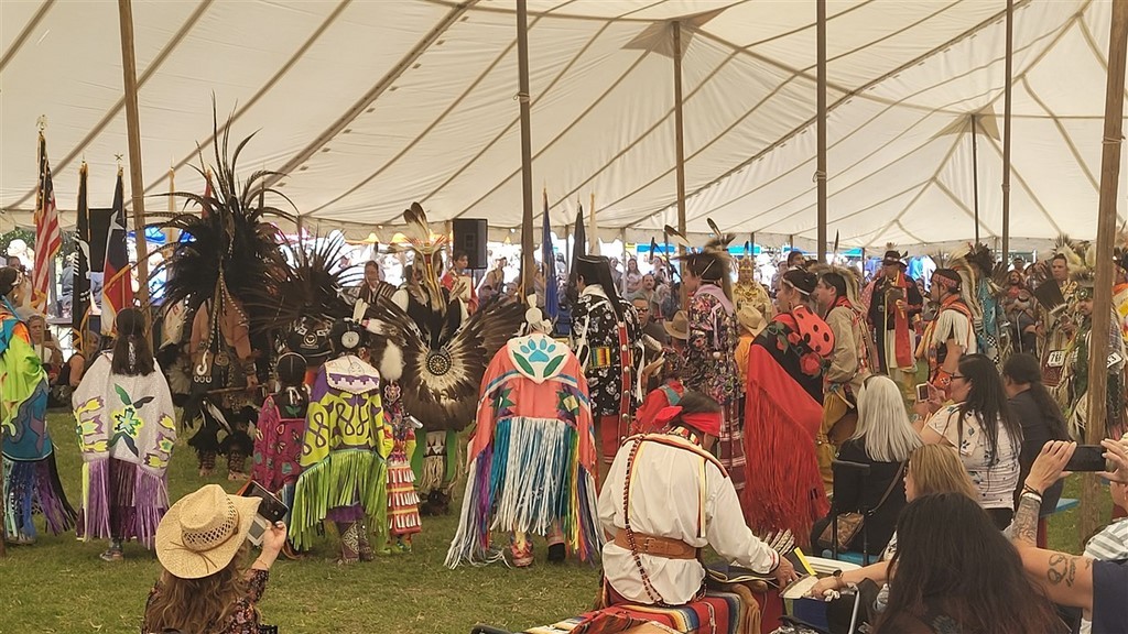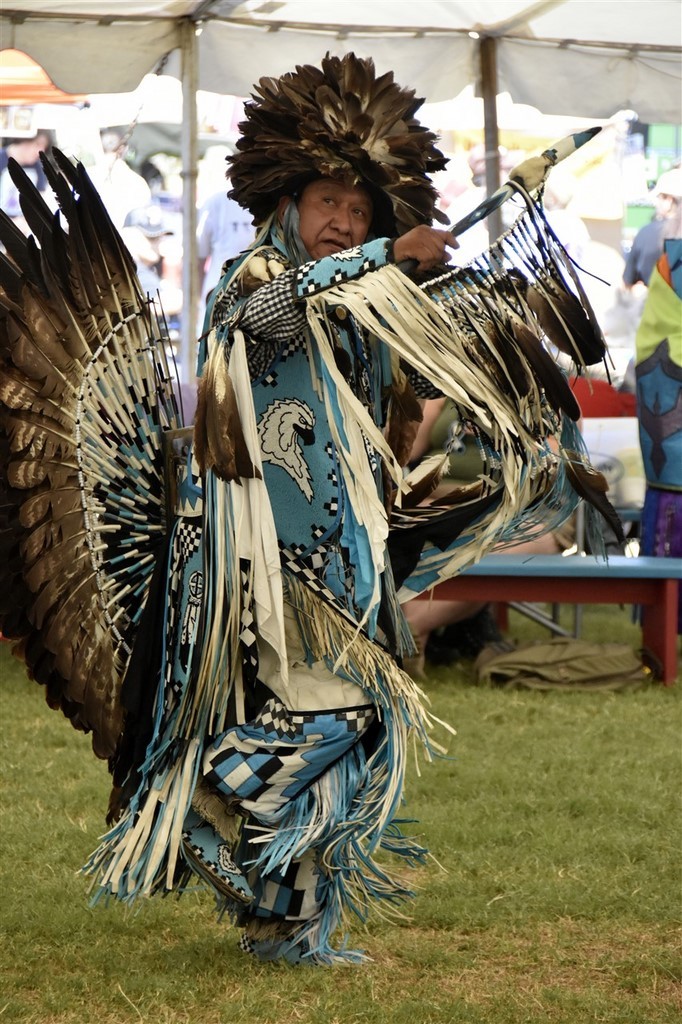 Une fois la cérémonie d’ouverture terminée, la suite se passe sous une grande tente. L’entrée de tous les danseurs est un spectacle incroyable. Ils sont tous en tenue traditionnelle, de fête ou guerrière, y compris les enfants, et ils dansent au son des tambours. On n’a pas compté mais probablement plus d’une centaine de danseurs. Comme tribus, il y a les Osage, les Crow, les Cheyenne, les Hopis, les Blackfeet, voire probablement d’autres. Des Aztèques ont été invités en tant que voisins. On mitraille. Pascal a pris quatre cents photos avec son appareil Nikon et Pascale plus de cent sur les téléphones. Il y a du tri à faire sans compter les vidéos. Après cette première présentation a lieu la compétition. Tout d’abord les moins de six ans. Ils sont trop chou et ils ont tous gagné. Puis les vétéranes, les 7-17 ans, les hommes, les femmes, les couples, les familles…. Ces danses de compétition sont entrecoupées de danses toujours traditionnelles où tout le monde peut participer même s’il n’est pas en tenue. On ne comprend pas tout ce qui se dit. Plusieurs fois, une quête est faite avec un tapis indien sur le sol où l’assistance vient déposer des billets. On n’a pas élucidé le but de ces quêtes mais il y a beaucoup de billets.