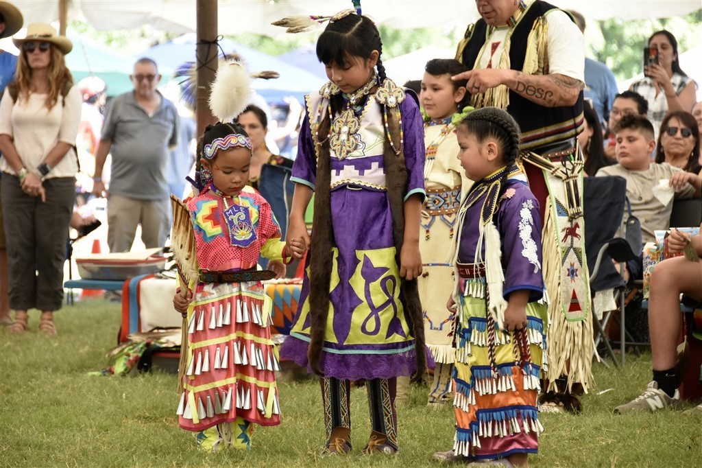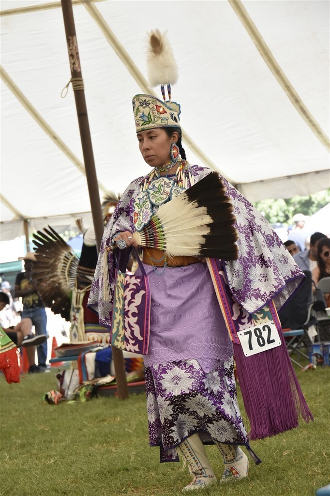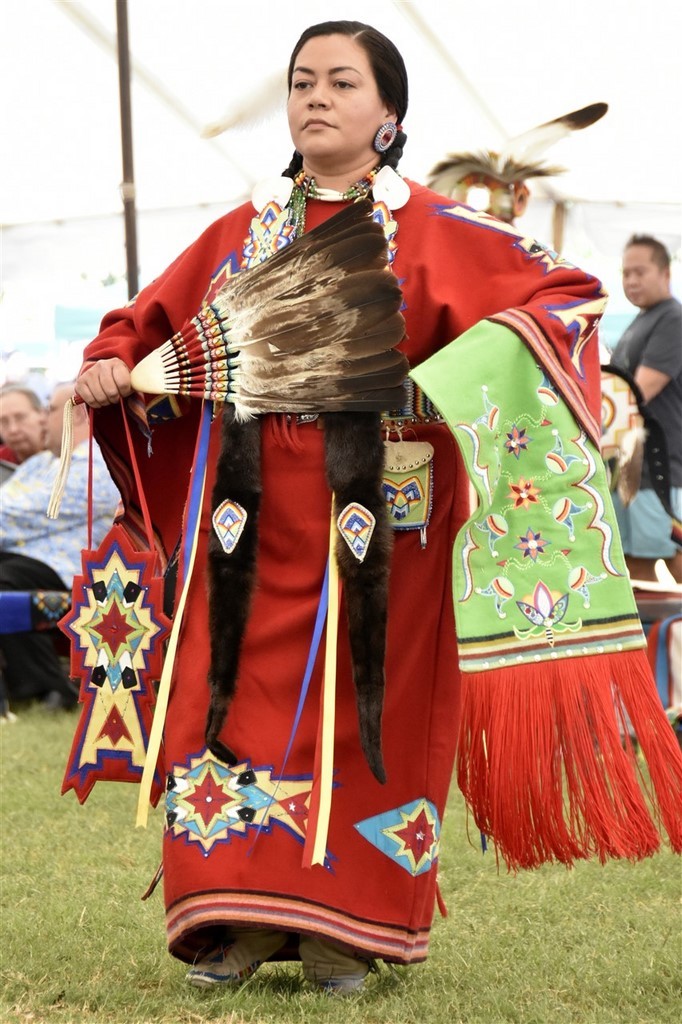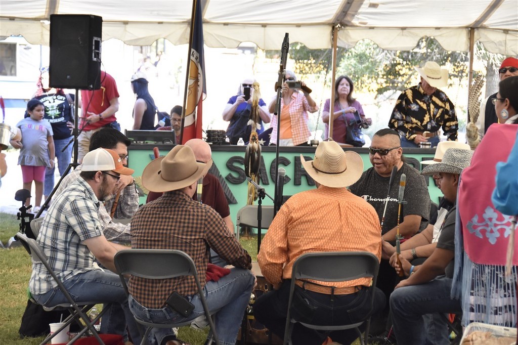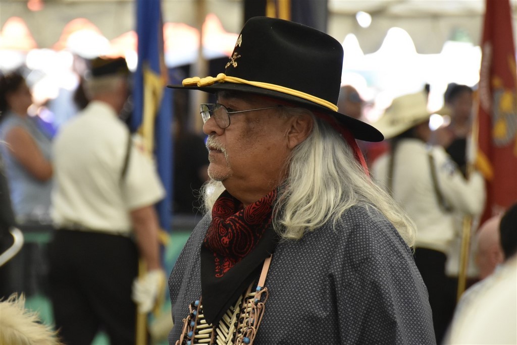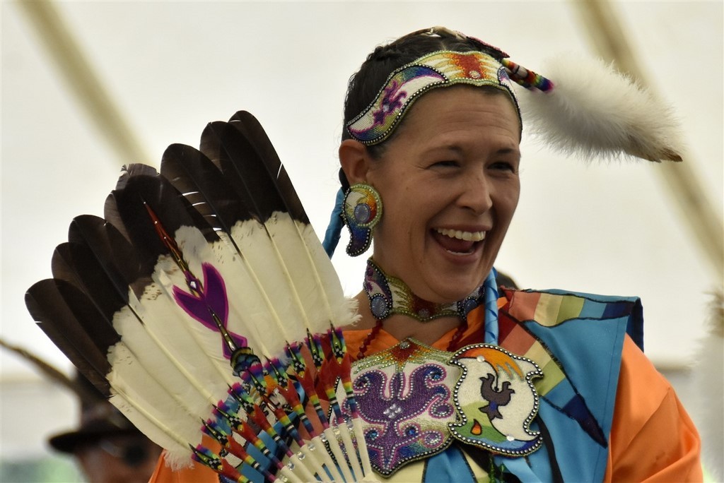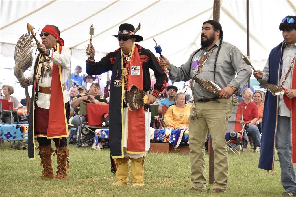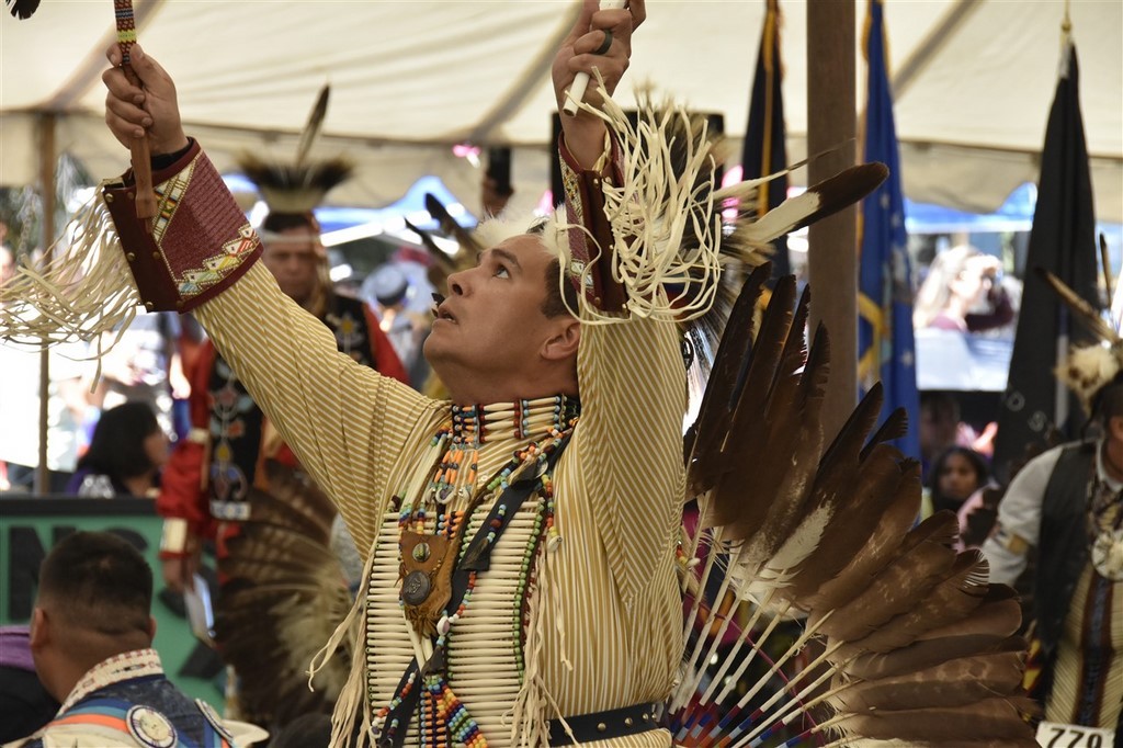 Une fois la cérémonie d’ouverture terminée, la suite se passe sous une grande tente. L’entrée de tous les danseurs est un spectacle incroyable. Ils sont tous en tenue traditionnelle, de fête ou guerrière, y compris les enfants, et ils dansent au son des tambours. On n’a pas compté mais probablement plus d’une centaine de danseurs. Comme tribus, il y a les Osage, les Crow, les Cheyenne, les Hopis, les Blackfeet, voire probablement d’autres. Des Aztèques ont été invités en tant que voisins. On mitraille. Pascal a pris quatre cents photos avec son appareil Nikon et Pascale plus de cent sur les téléphones. Il y a du tri à faire sans compter les vidéos. Après cette première présentation a lieu la compétition. Tout d’abord les moins de six ans. Ils sont trop chou et ils ont tous gagné. Puis les vétéranes, les 7-17 ans, les hommes, les femmes, les couples, les familles…. Ces danses de compétition sont entrecoupées de danses toujours traditionnelles où tout le monde peut participer même s’il n’est pas en tenue. On ne comprend pas tout ce qui se dit. Plusieurs fois, une quête est faite avec un tapis indien sur le sol où l’assistance vient déposer des billets. On n’a pas élucidé le but de ces quêtes mais il y a beaucoup de billets.